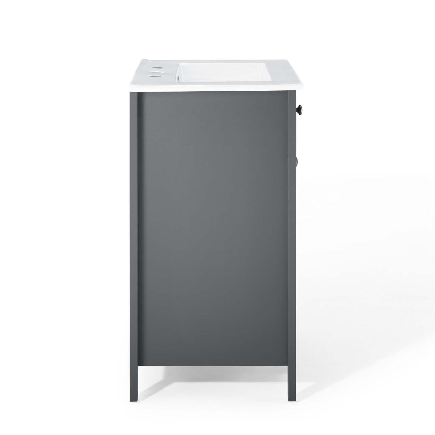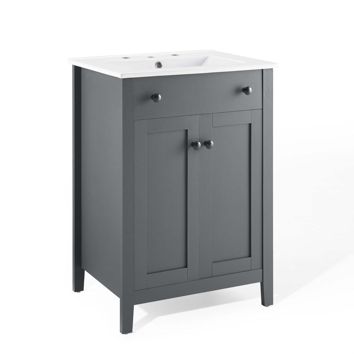 Experience the understated elegance of the Nantucket Bathroom Vanity. This stunning piece boasts clean lines and a sophisticated design that effortlessly enhances your bathroom decor. Crafted from durable wood and MDF particleboard, the Nantucket Vanity stands on four tapered legs and offers concealed storage shelves with soft-close doors. With its curved basin and 8-inch centerset faucet holes, this vanity seamlessly combines style and functionality for a contemporary bathroom. The Nantucket also comes with non-marking foot caps to safeguard your flooring. Assembly is required, and fixtures are not included. Set includes: One - Nantucket 24'' Bathroom Vanity.