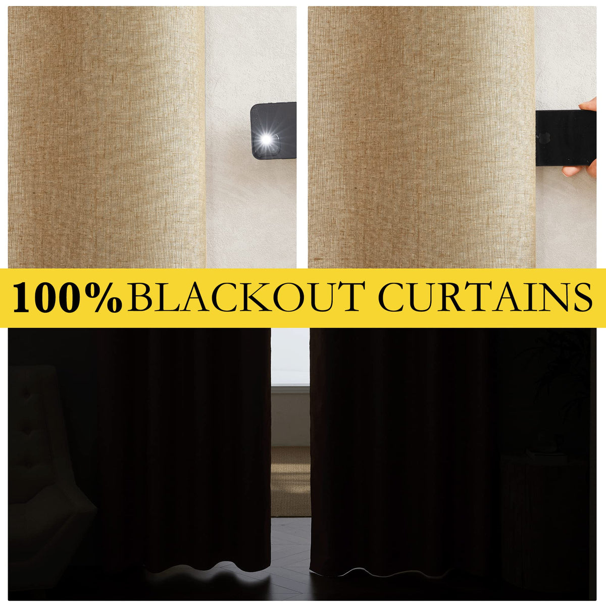 Nicetown 100% Absolutely Blackout Linen Curtains With Thermal Insulated White Liner, Camel, W52 X L108, 2 Panels, Textured Linen Look Noise Reducing Window Treatments Drapes For Bedroom/Living Room