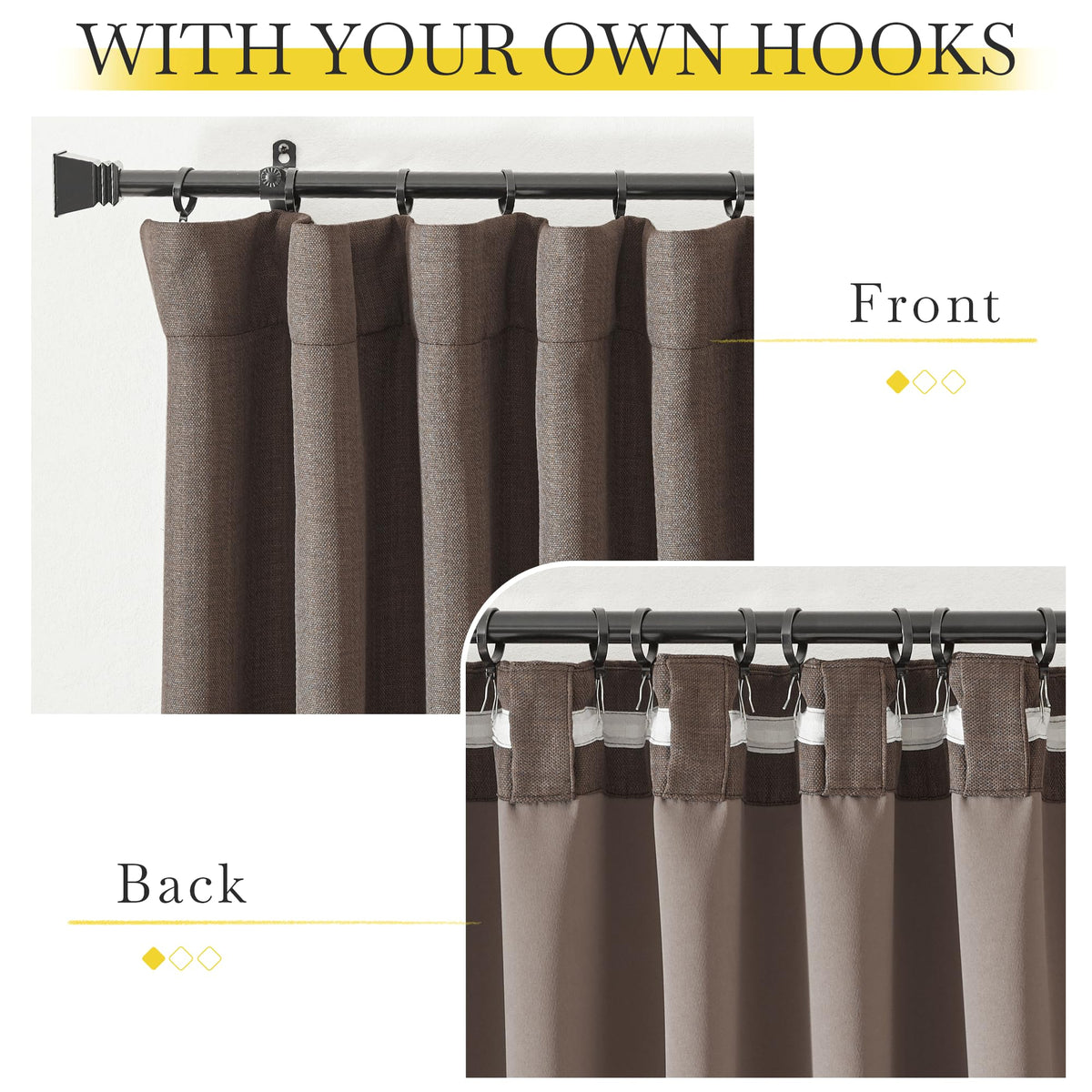 Q: How do I hang these curtains?A: These curtains offer versatile hanging options. You can use the back tab, rod pocket, or small hooks on the hook belt to achieve an elegant pinch pleated look.