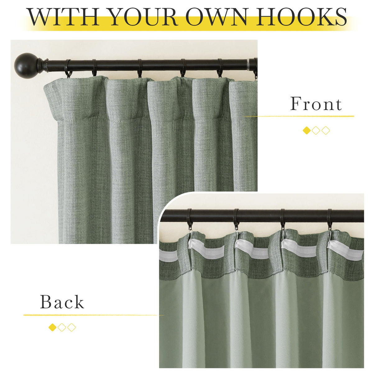 Q: How do I hang these curtains?A: These curtains offer three hanging options: you can use the back tab, rod pocket, or small hooks on the hook belt for a pinch pleated look, allowing you to choose the style that best fits your decor.
