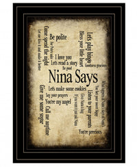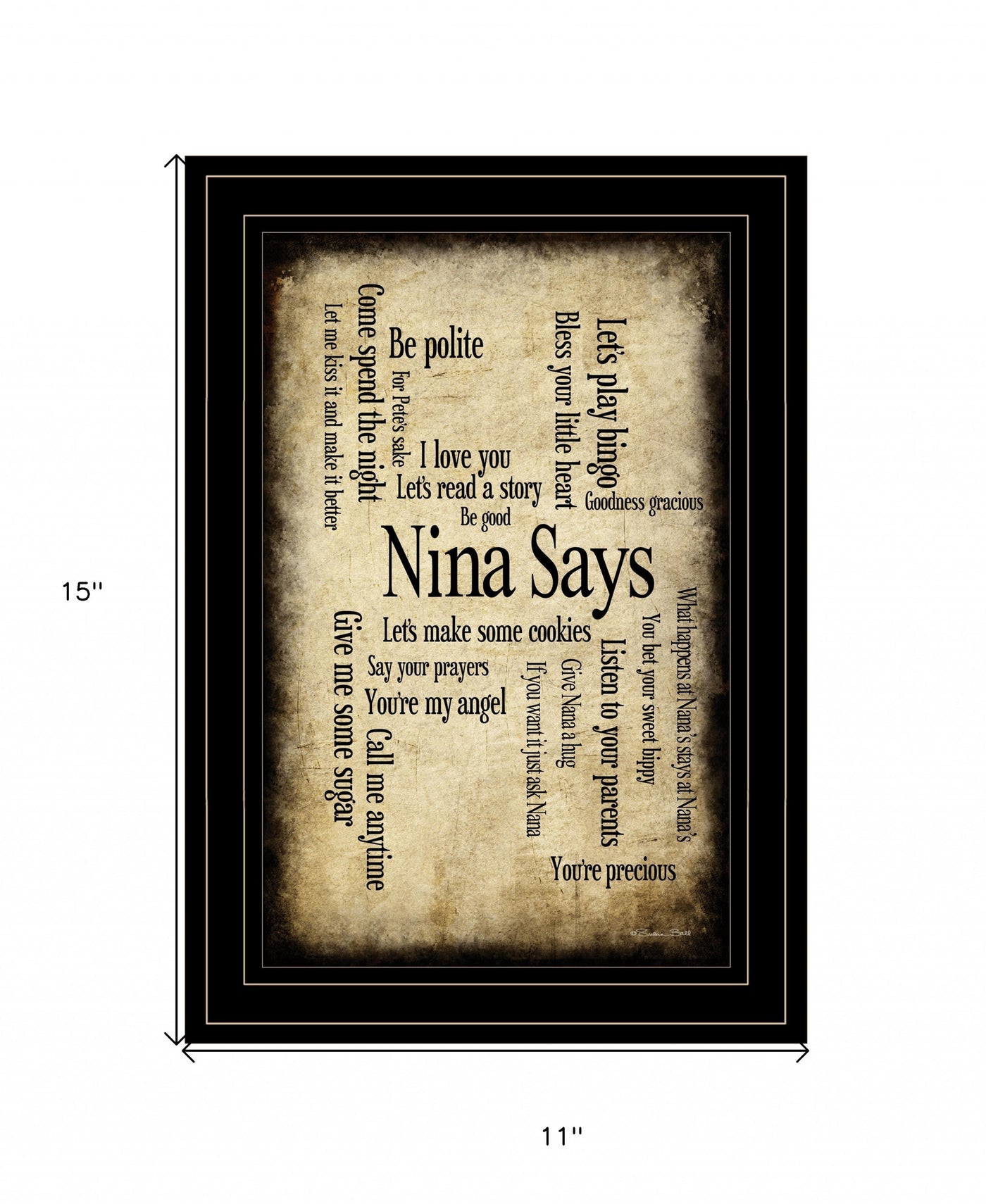 Unique and decorative, this nina says 3 black framed print wall art will leave a lasting impression. This print is a visual artistic expression that allows you to decorate your space in reproduced for you on paper, this hanging decorative accent will be a trendy and fashionable way to dress your walls. Adding this hanging wall art to your space to make your room feel more and attractive. 15' H x 11' W x 1' D