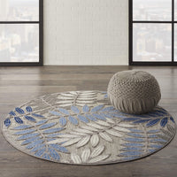 Nourison Aloha Indoor/Outdoor Grey/Blue 5'3' X Round Area Rug, Tropical, Botanical, Easy Cleaning, Non Shedding, Bed Room, Kitc