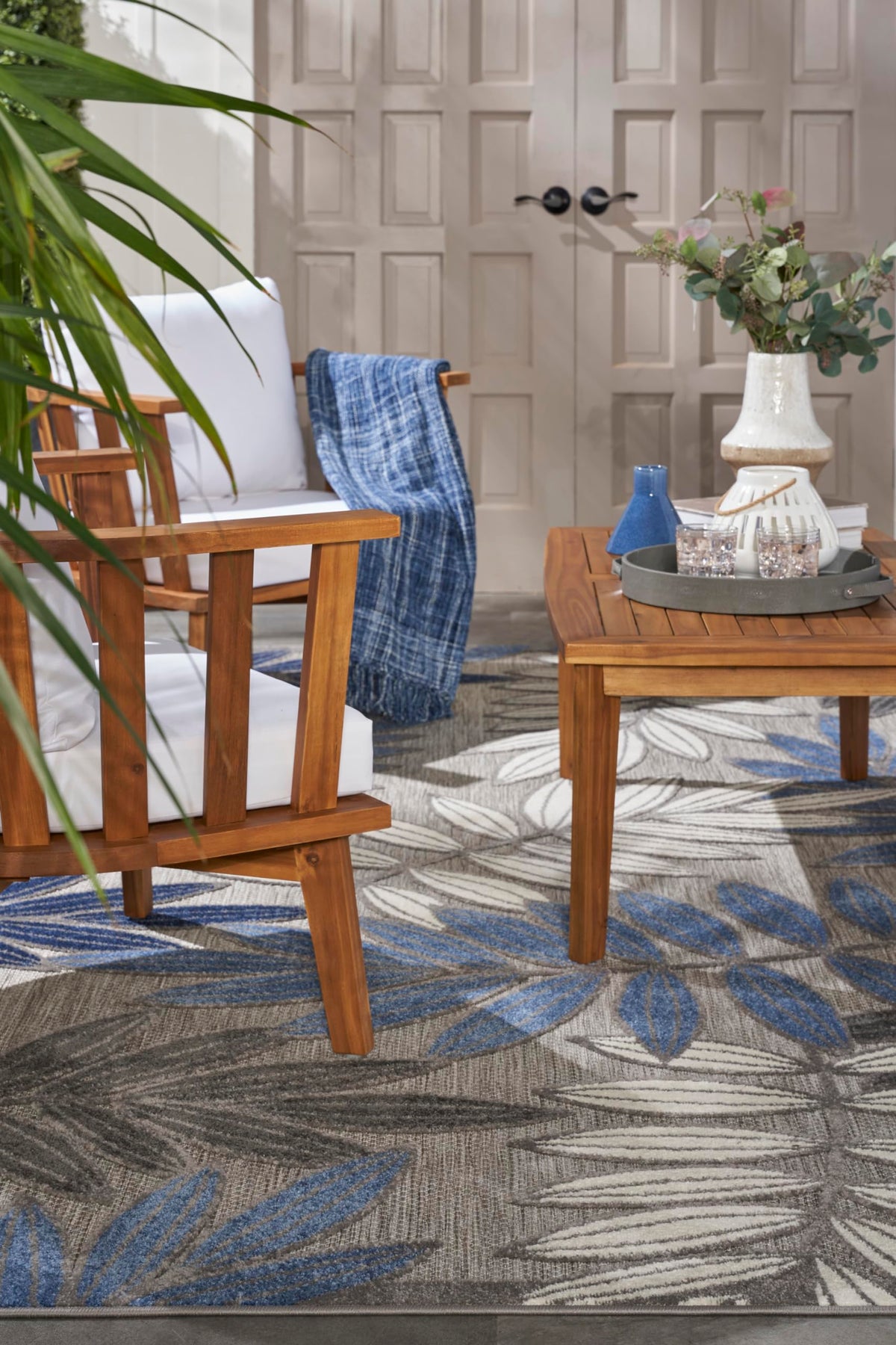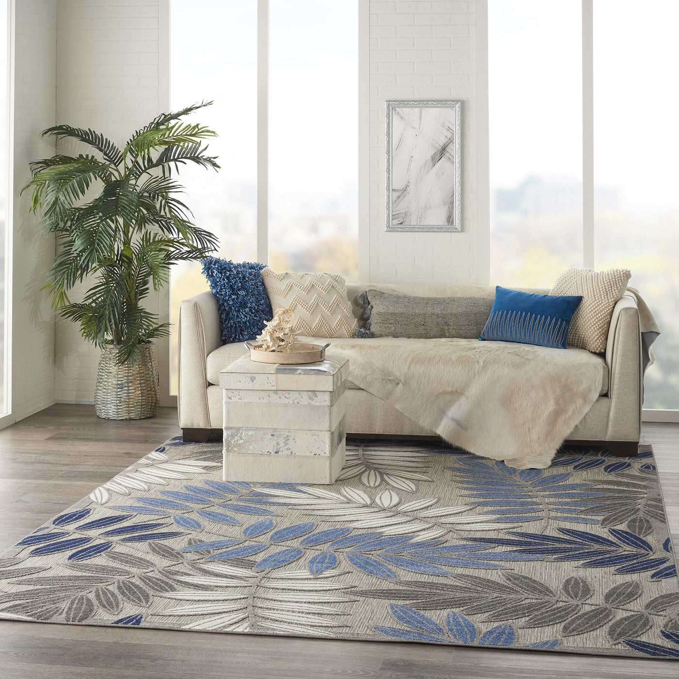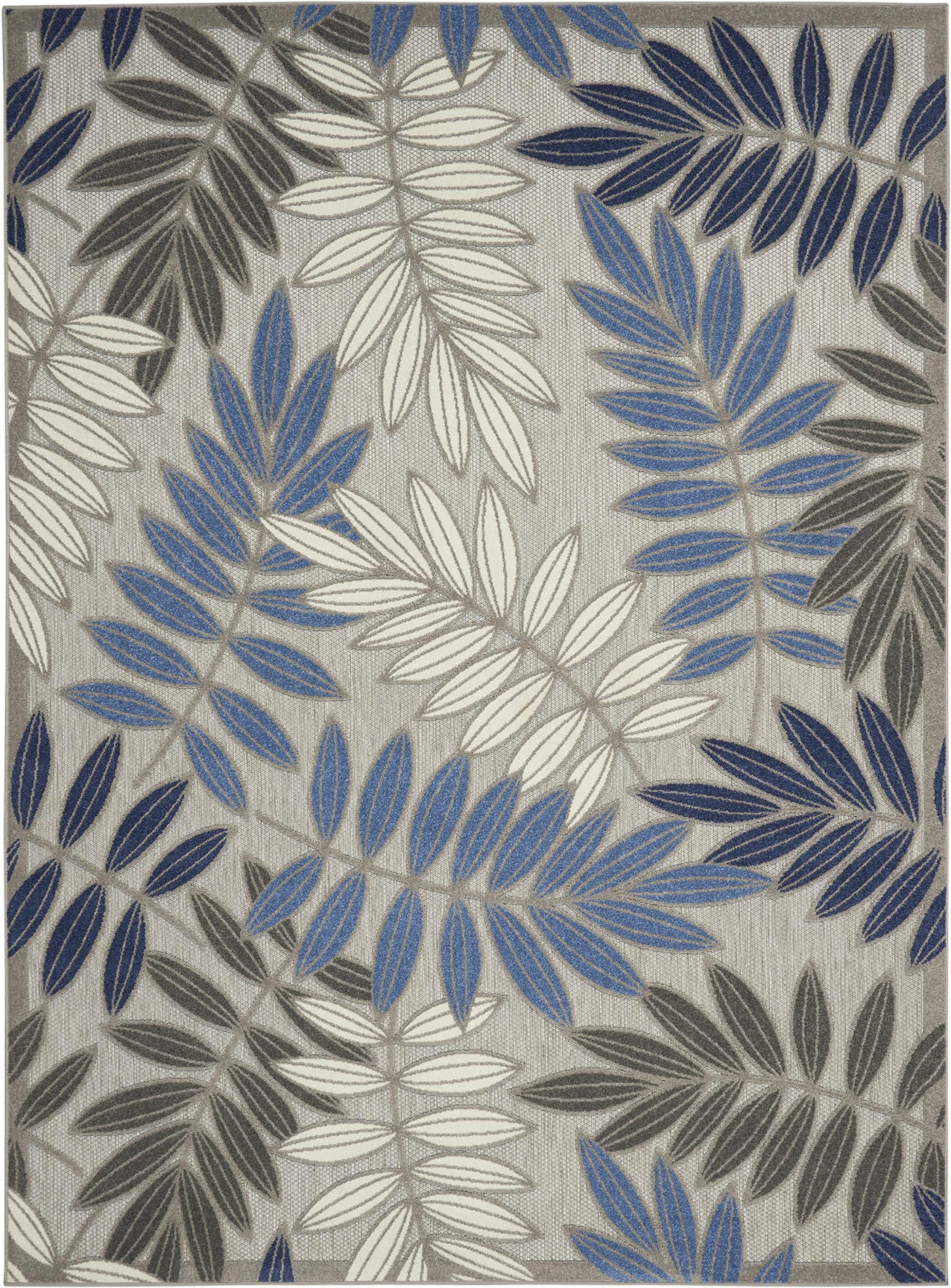 This sunny and sensational collection of flat woven outdoor rugs is pretty, practical and simply perfect for high traffic areas. With its inviting assortment of classic and contemporary designs, tempting color palettes and terrific textures, these multipurpose rugs will afford an air of simple sophistication to any environment.100% Polypropylene • Flat Woven A cheerful and charming oversized leaf design is a fun, flirty and fashionable way to uplift any environment, especially when presented in complementary hues of blue, turquoise, cream and grey. This Aloha outdoor area rug from Nourison is created from premium stain-resistant fibers for long wear, low maintenance, and a splendid texture.
