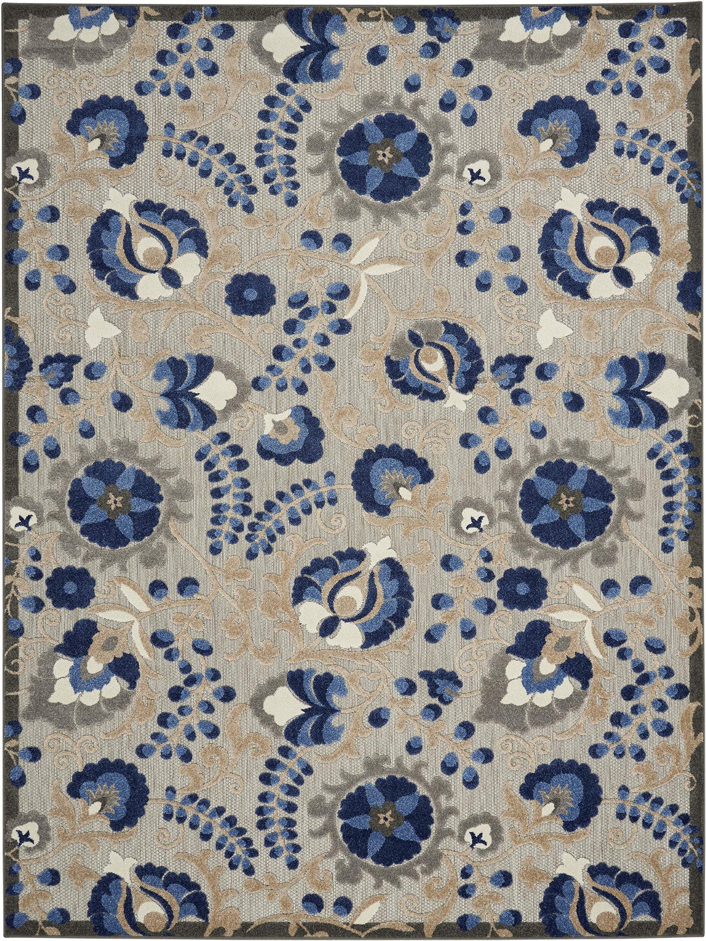 This sunny and sensational collection of flat woven indoor/outdoor rugs is pretty, practical and simply perfect for high traffic areas. With its inviting assortment of classic and contemporary designs, tempting color palettes and terrific textures, these multipurpose rugs will afford an air of simple sophistication to any environment. 100% polypropylene flat woven in swirling vines and flowers of blue, turquoise, cream and grey, this Nourison outdoor rug complements your patio, porch or poolside setting. High-low textures combine plush patterns with an intricately woven base for exceptional look and feel that will stand up under any conditions. Created from premium stain-resistant fibers for long wear, low maintenance, and a splendid texture.