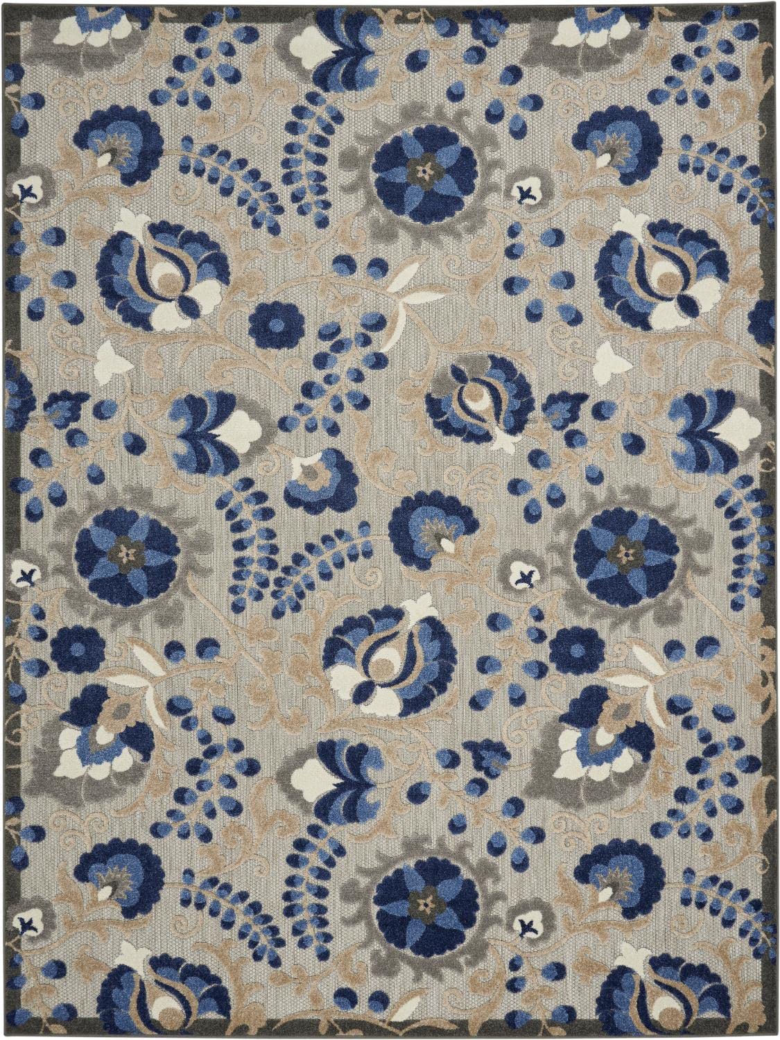 This sunny and sensational collection of flat woven outdoor rugs is pretty, practical and simply perfect for high traffic areas. With its inviting assortment of classic and contemporary designs, tempting color palettes and terrific textures, these multipurpose rugs will afford an air of simple sophistication to any environment.100% Polypropylene • Flat Woven In swirling vines and flowers of blue, cream and grey, this Aloha outdoor rug complements your patio, porch or poolside setting. A high-low weave combines textural patterns with an intricately woven base for exceptional look that stands up to the elements. Created from premium stain-resistant fibers for long wear, low maintenance, and a splendid texture.