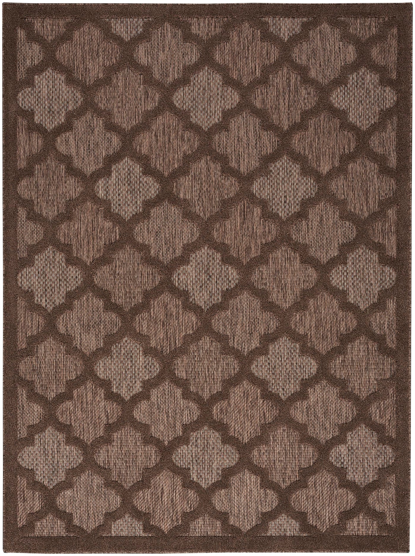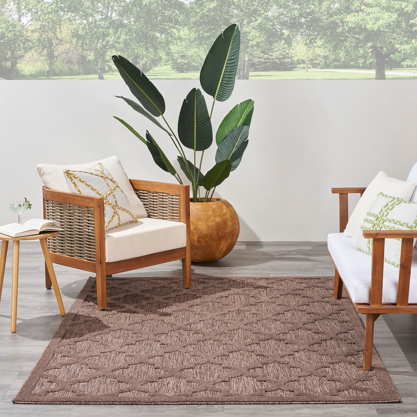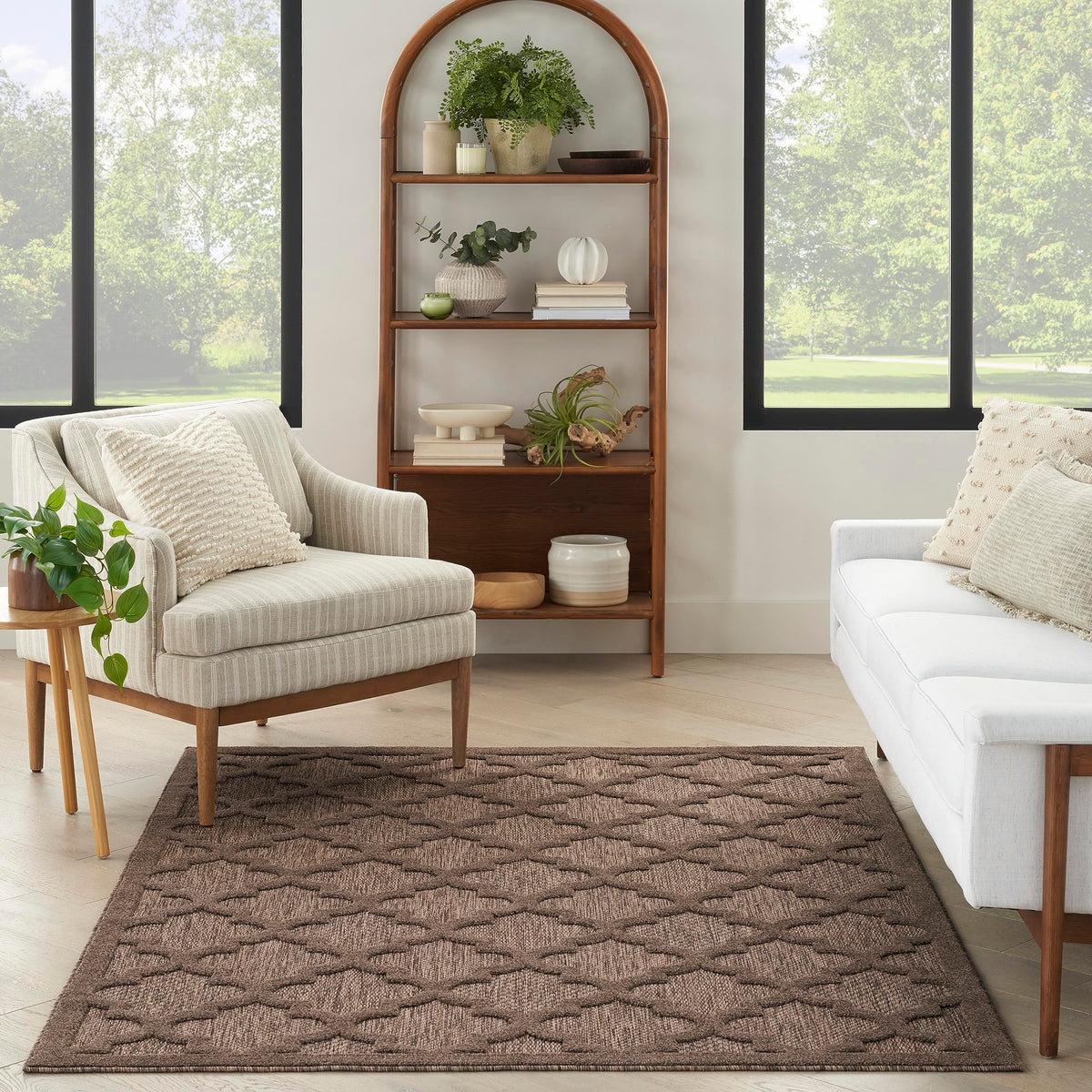 Refresh your home with the stylish designs showcased in the Nourison Easy Care Rug Collection. Featuring a flatweave ground with a softly textured high-low pattern, these indoor/outdoor rugs bring pleasing dimension to just about any space – from the living room, entryway, or kitchen to the porch, patio, deck, or balcony. Machine made from durable, low-shed, easy-clean fibers that are great in busy households and for all seasons spent outdoors. Ground your indoor or outdoor seating area in the stylish appeal of this outdoor rug from the Easy Care Collection. The space-dyed backdrop, presented in comforting brown earth tones, is enhanced by a raised Moroccan trellis pattern that adds an appealing sense of depth. Place it in your living room, dining room, entryway, or favorite outdoor space such as the patio, porch, or deck for an instant boost of inviting style. Machine-made from durable, low-shed fibers that are easy to clean, making this a great choice for all seasons spent outdoors.
