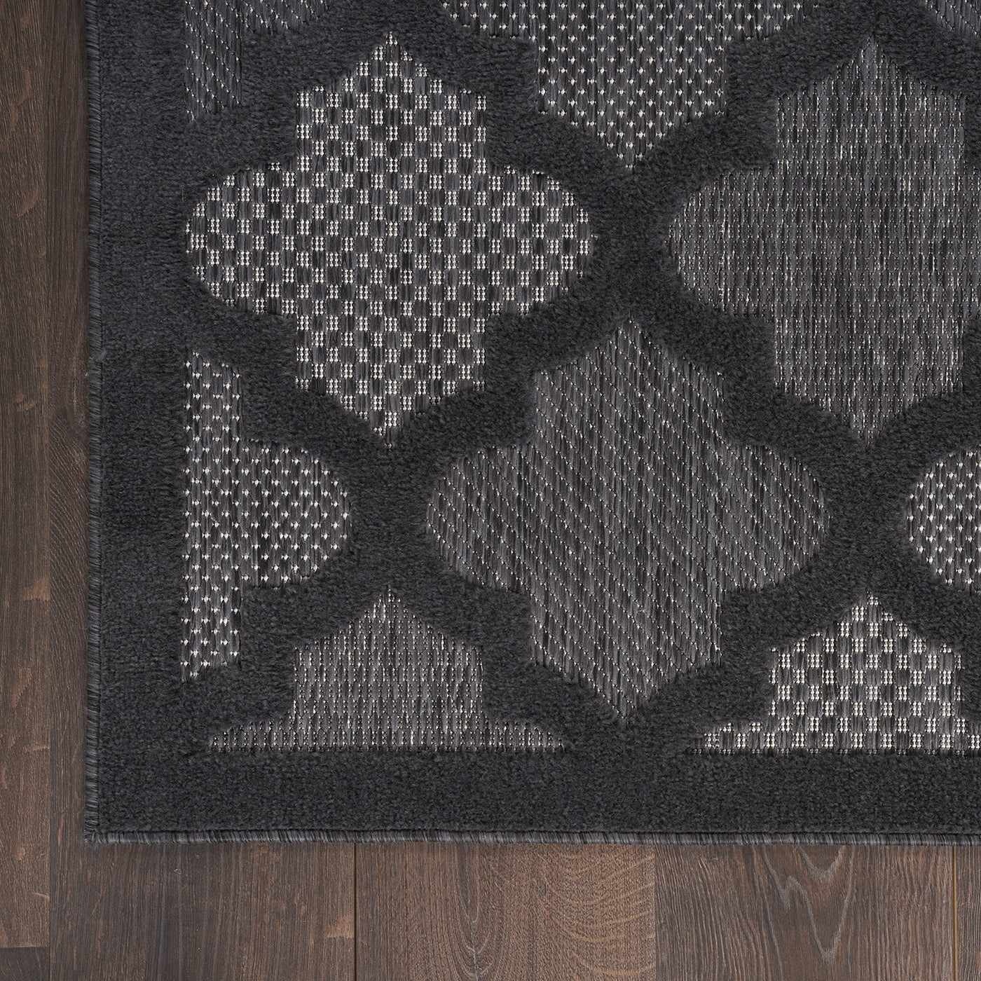 Refresh your home with the stylish designs showcased in the Nourison Easy Care Rug Collection. Featuring a flatweave ground with a softly textured high-low pattern, these outdoor rugs bring pleasing dimension to just about any space – from the living room, entryway, or kitchen to the porch, patio, deck, or balcony. Machine made from durable, low-shed, easy-clean fibers that are great in busy households and for all seasons spent outdoors. Ground your indoor or outdoor seating area in the stylish appeal of this indoor/outdoor rug from the Easy Care Collection. With a charcoal grey and black backdrop that showcases multiple flatweave styles, enhanced by a raised Moroccan trellis pattern in black, this contemporary rug adds an appealing sense of depth to your surroundings. Place it in your living room, dining room, entryway, or favorite outdoor space such as the patio, porch, or deck for an instant style boost. Machine-made from durable, low-shed fibers that are easy to clean, making this a great choice for all seasons spent outdoors.