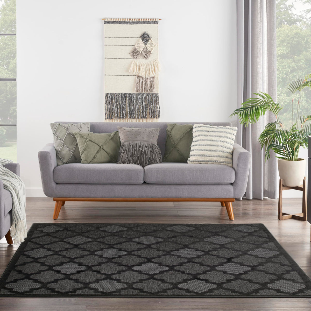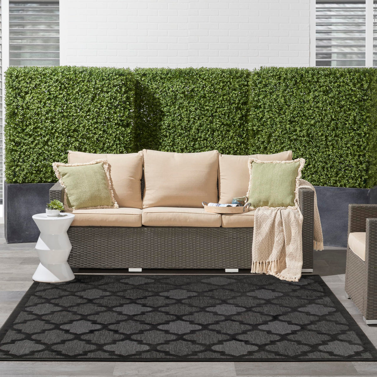 Refresh your home with the stylish designs showcased in the Nourison Easy Care Rug Collection. Featuring a flatweave ground with a softly textured high-low pattern, these outdoor rugs bring pleasing dimension to just about any space – from the living room, entryway, or kitchen to the porch, patio, deck, or balcony. Machine made from durable, low-shed, easy-clean fibers that are great in busy households and for all seasons spent outdoors. Ground your indoor or outdoor seating area in the stylish appeal of this indoor/outdoor rug from the Easy Care Collection. With a charcoal grey and black backdrop that showcases multiple flatweave styles, enhanced by a raised Moroccan trellis pattern in black, this contemporary rug adds an appealing sense of depth to your surroundings. Place it in your living room, dining room, entryway, or favorite outdoor space such as the patio, porch, or deck for an instant style boost. Machine-made from durable, low-shed fibers that are easy to clean, making this a great choice for all seasons spent outdoors.