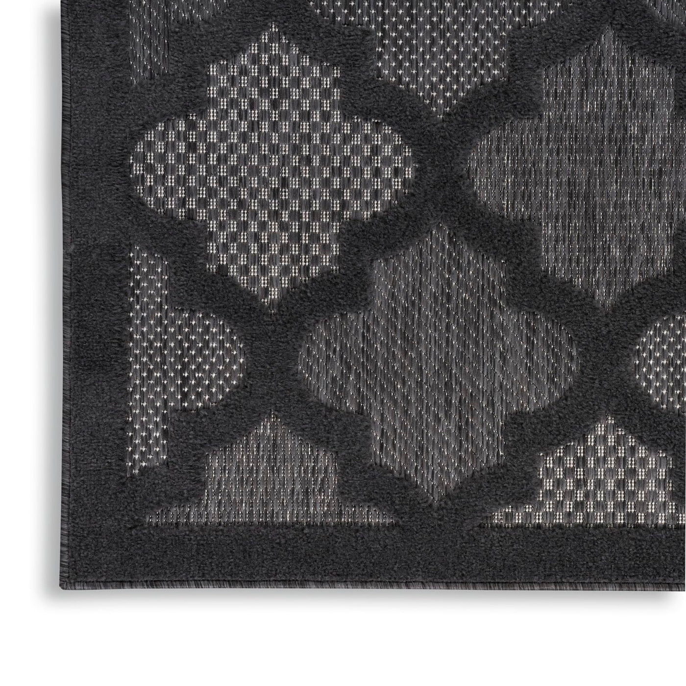 Refresh your home with the stylish designs showcased in the Nourison Easy Care Rug Collection. Featuring a flatweave ground with a softly textured high-low pattern, these indoor/outdoor rugs bring pleasing dimension to just about any space - from the living room, entryway, or kitchen to the porch, patio, deck, or balcony. Machine made from durable, low-shed, easy-clean fibers that are great in busy households and for all seasons spent outdoors. Ground your indoor or outdoor seating area in the stylish appeal of this indoor/outdoor rug from the Easy Care Collection. With a charcoal grey and black backdrop that showcases multiple flatweave styles, enhanced by a raised Moroccan trellis pattern in black, this contemporary rug adds an appealing sense of depth to your surroundings. Place it in your living room, dining room, entryway, or favorite outdoor space such as the patio, porch, or deck for an instant style boost. Machine-made from durable, low-shed fibers that are easy to clean, making this a great choice for all seasons spent outdoors.