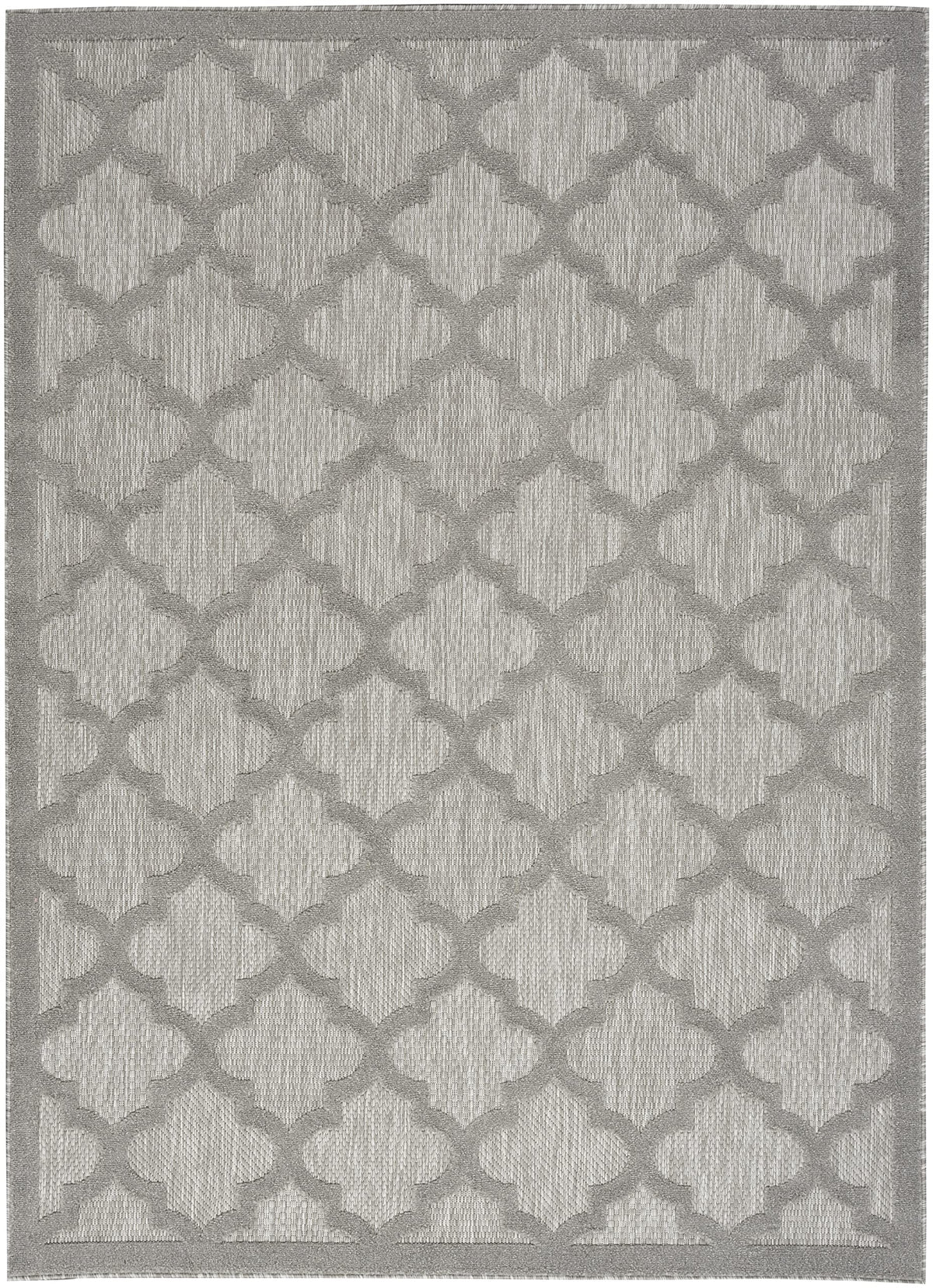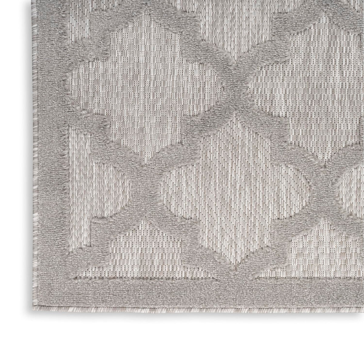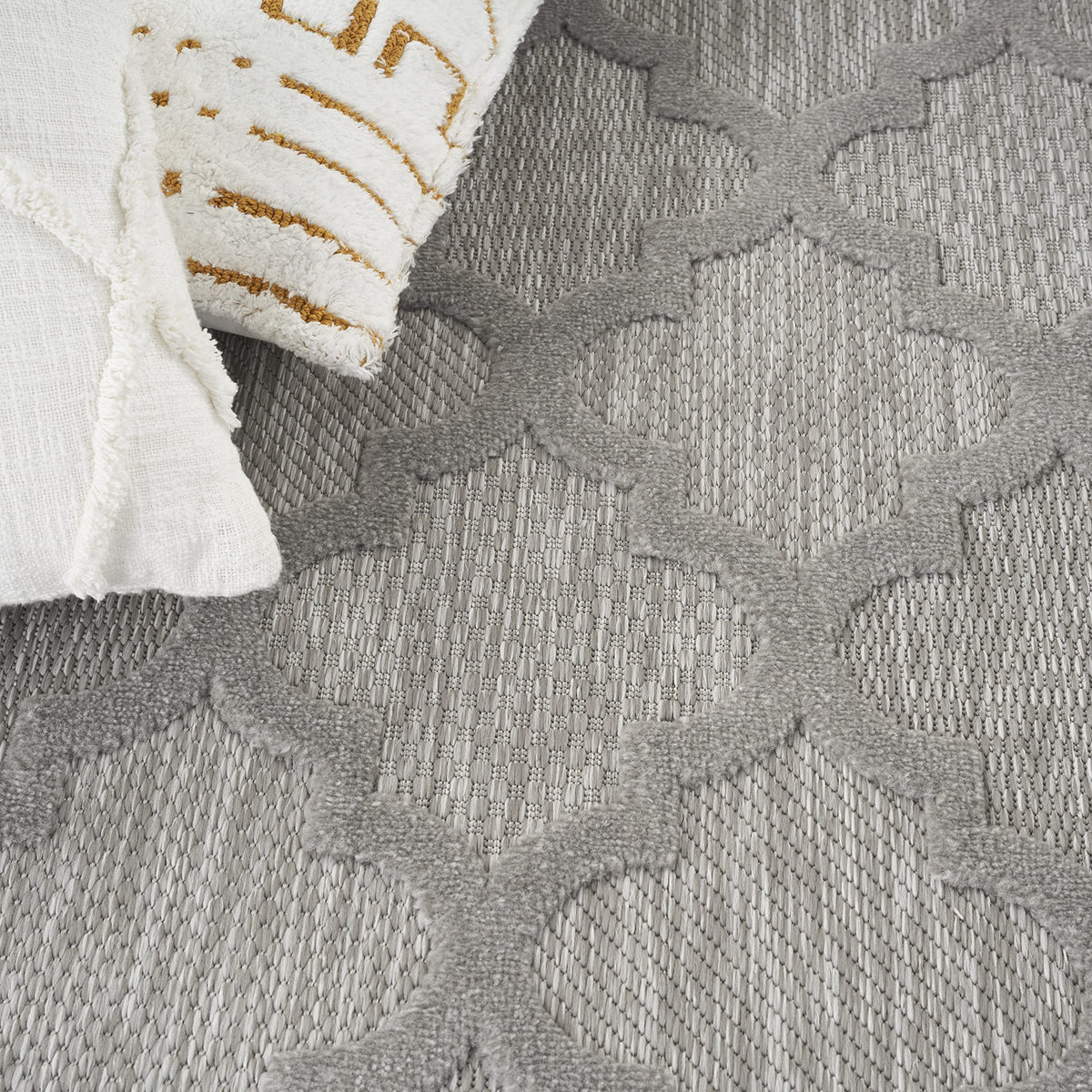 Refresh your home with the stylish designs showcased in the Nourison Easy Care Rug Collection. Featuring a flatweave ground with a softly textured high-low pattern, these outdoor rugs bring pleasing dimension to just about any space - from the living room, entryway, or kitchen to the porch, patio, deck, or balcony. Machine made from durable, low-shed, easy-clean fibers that are great in busy households and for all seasons spent outdoors. Ground your indoor or outdoor seating area in the stylish appeal of this outdoor rug from the Easy Care Collection. With a backdrop that showcases multiple flatweave styles, enhanced by a raised Moroccan trellis pattern in silver grey, this contemporary rug adds an appealing sense of depth to your surroundings. Place it in your living room, dining room, entryway, or favorite outdoor space such as the patio, porch, or deck for an instant style boost. Machine-made from durable, low-shed fibers that are easy to clean, making this a great choice for all seasons spent outdoors.
