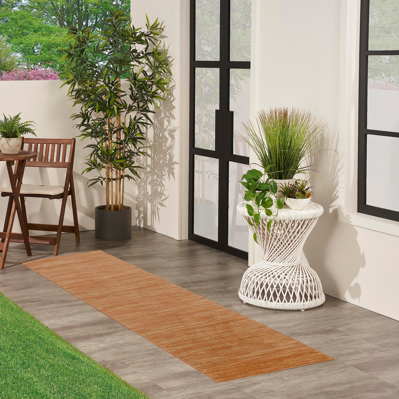 Busy, active lifestyles demand fuss-free décor, and this outdoor rug collection has it all. Nourison Essentials area rugs give you everything you want, and more! These handsome, solid color and patterned area rugs are crafted for rugged performance, but never sacrifice style for function. With a low cut pile, each Essentials rug is designed to withstand heavy traffic, including kids and pets. You'll appreciate the durability, easy care, and soft texture of this contemporary rug collection in a wide range of colors and sizes to fit every indoor and outdoor space. Ideal for your porch, patio, balcony, poolside and deck, or living room, dining room, and other gathering places. 100% polypropylene fibers can be vacuumed, hose-rinsed and air-dried. For even longer life, bring indoors during extreme weather. Designed for busy, active lifestyles, this rust orange outdoor rug from the Nourison Essentials Collection is the ideal pairing of style and practicality. The simple, solid pattern is enhanced with subtle tonal variations and a surprisingly soft texture that’s equally suitable for any room inside the home. Machine-made with a low-profile construction from easy to clean polypropylene yarns, this modern rug easily withstands heavy traffic, does not shed, and can be vacuumed or hose rinsed. To extend the life of your rug, bring it indoors during extreme weather.