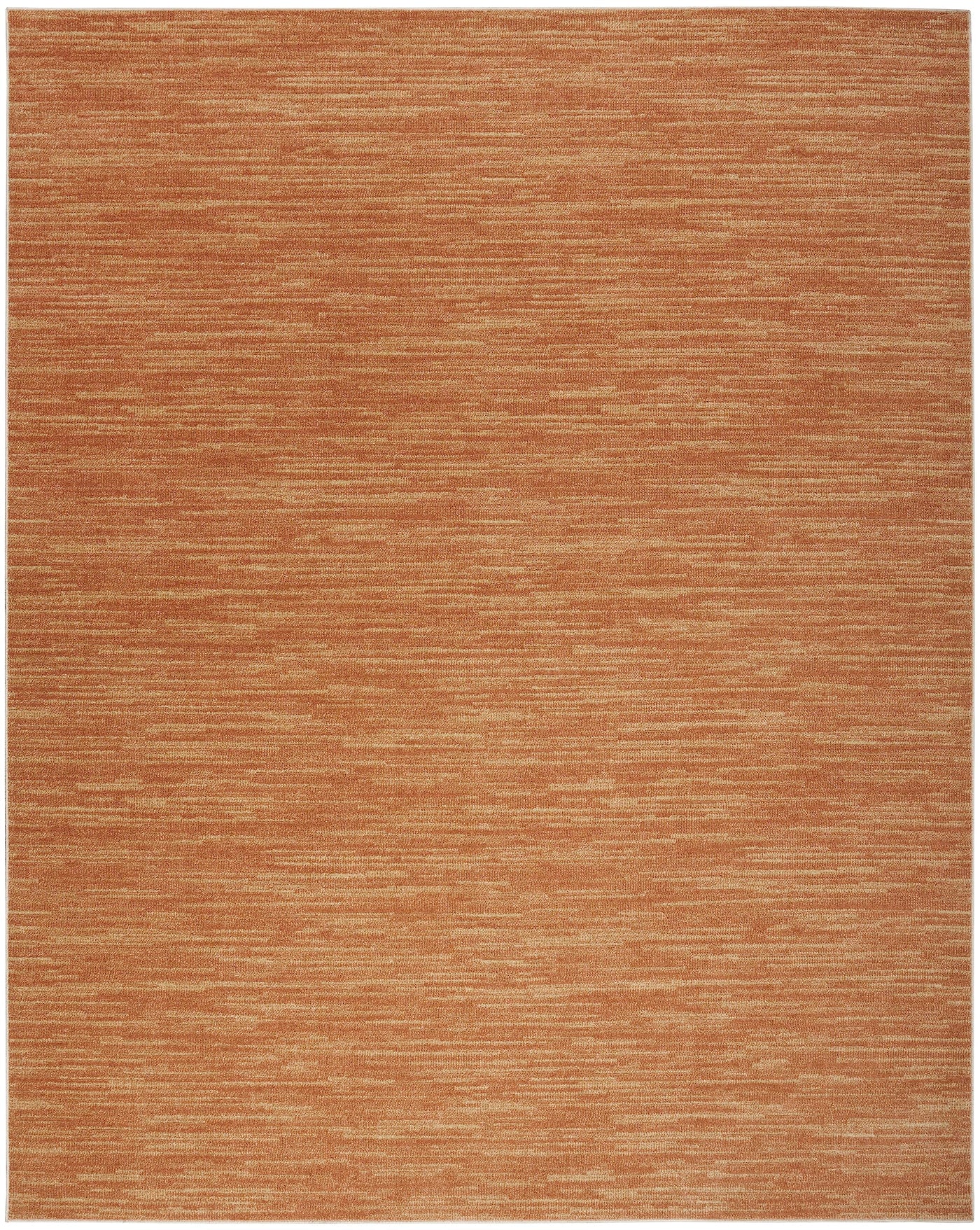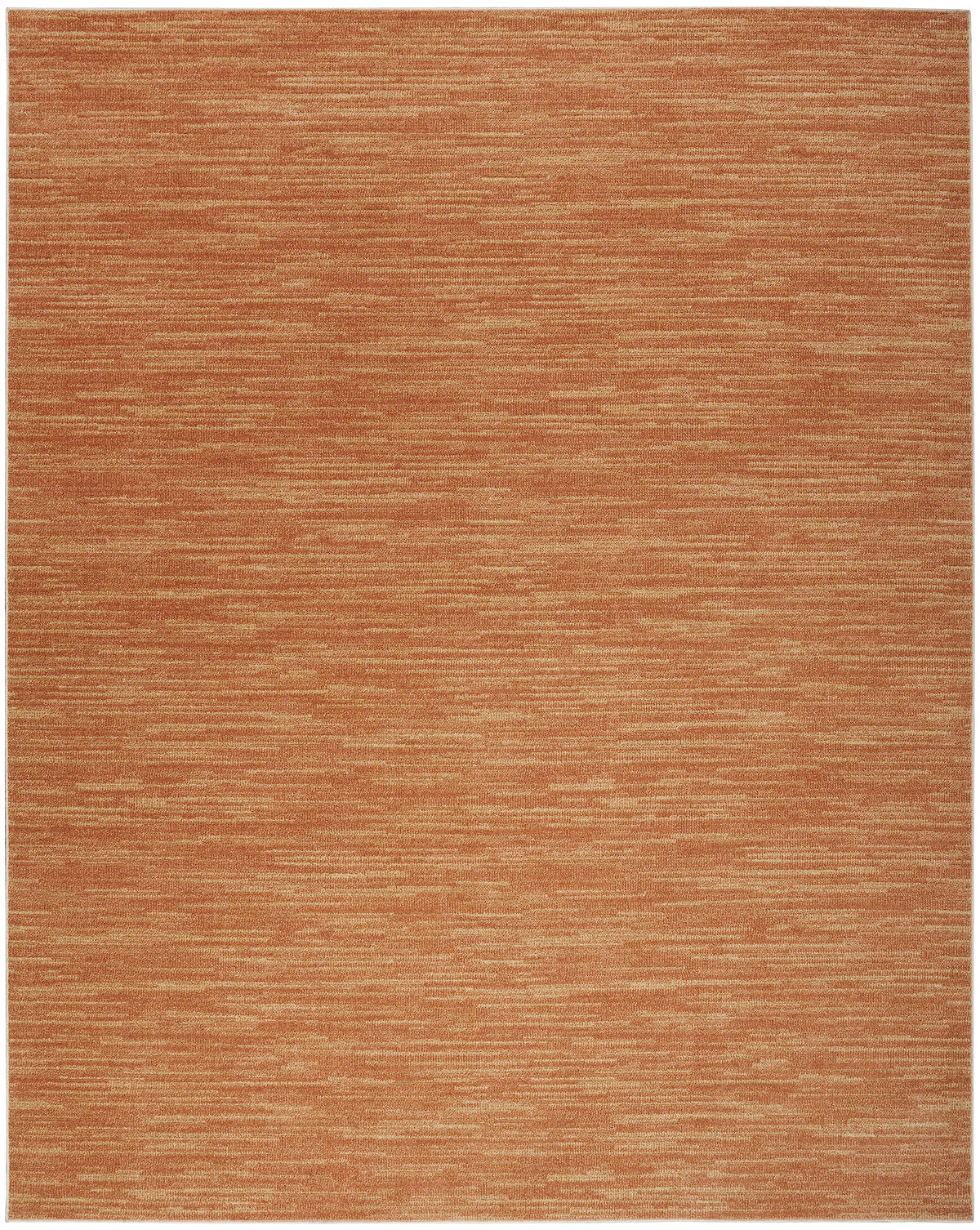 Busy, active lifestyles demand fuss-free décor, and this outdoor rug collection has it all. Nourison Essentials area rugs give you everything you want, and more! These handsome, solid color and patterned area rugs are crafted for rugged performance, but never sacrifice style for function. With a low cut pile, each Essentials rug is designed to withstand heavy traffic, including kids and pets. You'll appreciate the durability, easy care, and soft texture of this contemporary rug collection in a wide range of colors and sizes to fit every indoor and outdoor space. Ideal for your porch, patio, balcony, poolside and deck, or living room, dining room, and other gathering places. 100% polypropylene fibers can be vacuumed, hose-rinsed and air-dried. For even longer life, bring indoors during extreme weather. Designed for busy, active lifestyles, this rust orange outdoor rug from the Nourison Essentials Collection is the ideal pairing of style and practicality. The simple, solid pattern is enhanced with subtle tonal variations and a surprisingly soft texture that’s equally suitable for any room inside the home. Machine-made with a low-profile construction from easy to clean polypropylene yarns, this modern rug easily withstands heavy traffic, does not shed, and can be vacuumed or hose rinsed. To extend the life of your rug, bring it indoors during extreme weather.