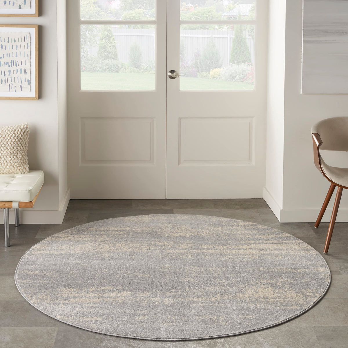 Nourison Essentials Indoor/Outdoor Solid Abstract Grey/Beige 4' X Round Area Rug, Easy Cleaning, Non Shedding, Bed Room, Living Room, Dining Room, Backyard, Deck, Patio (4 Round)