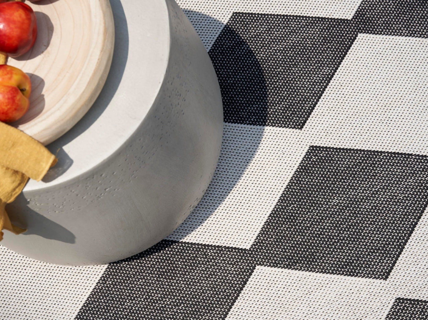 Upgrade your outdoor lifestyle with the rich, textural appeal of a Positano outdoor rug. These flatweave rugs are elegant enough for your living room or dining room, yet durable enough to enjoy outdoors on your porch, patio, or deck! Choose from a spectrum of versatile neutrals and colorful rugs that display exciting variations thanks to the space-dyed, striated yarns. Machine-made from polypropylene for easy cleaning: just hose rinse and air dry. Make a statement both inside and outside your home with this checkered diamond outdoor rug from the Positano collection. The retro tile-inspired design adds a stunning pop of pattern, boosted by a space-dyed color effect in black. This versatile rug is flat woven for easy placement in all your most used rooms – from the living room, kitchen, and bathroom to the patio, backyard, or deck.