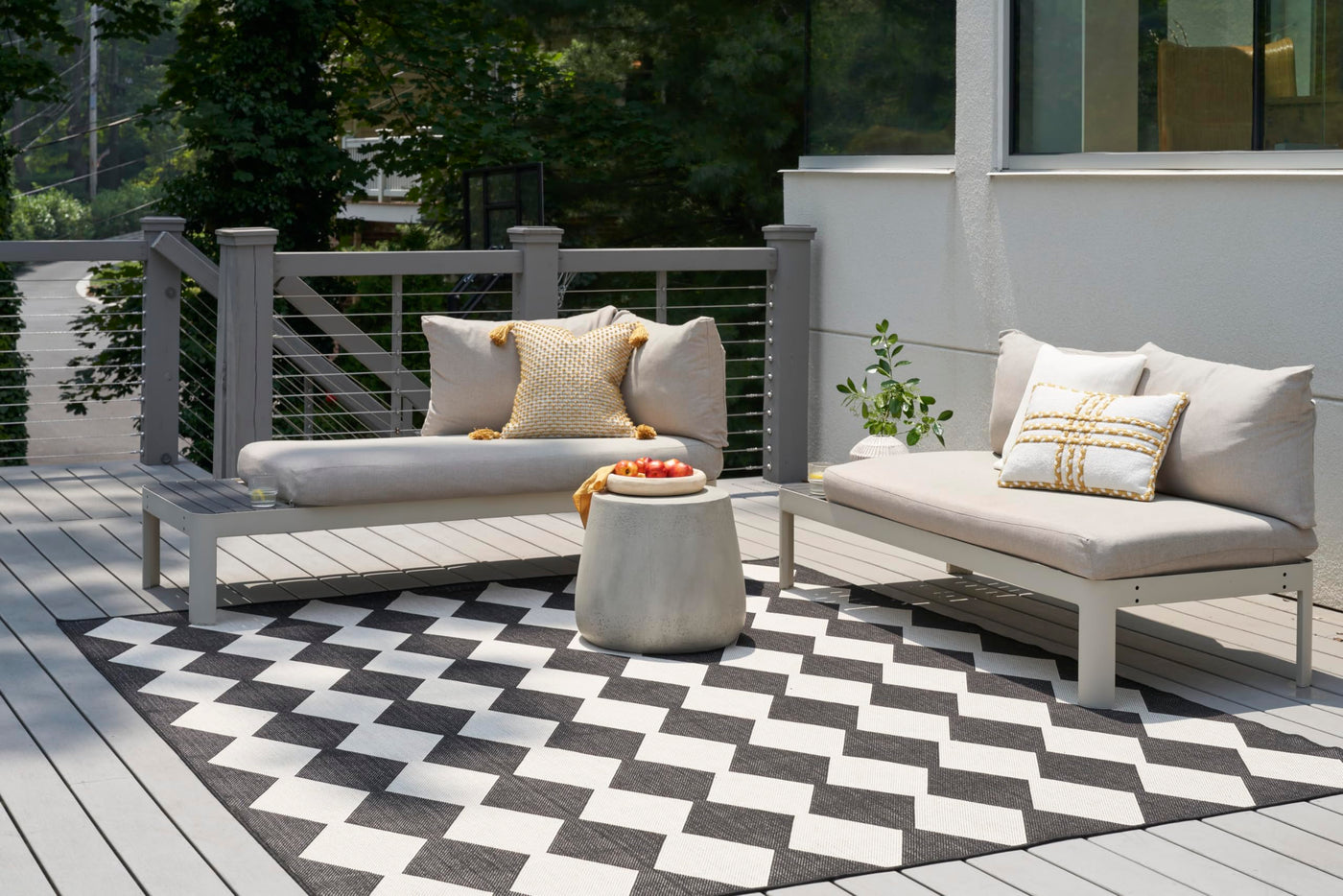 Upgrade your outdoor lifestyle with the rich, textural appeal of a Positano outdoor rug. These flatweave rugs are elegant enough for your living room or dining room, yet durable enough to enjoy outdoors on your porch, patio, or deck! Choose from a spectrum of versatile neutrals and colorful rugs that display exciting variations thanks to the space-dyed, striated yarns. Machine-made from polypropylene for easy cleaning: just hose rinse and air dry. Make a statement both inside and outside your home with this checkered diamond outdoor rug from the Positano collection. The retro tile-inspired design adds a stunning pop of pattern, boosted by a space-dyed color effect in black. This versatile rug is flat woven for easy placement in all your most used rooms – from the living room, kitchen, and bathroom to the patio, backyard, or deck.