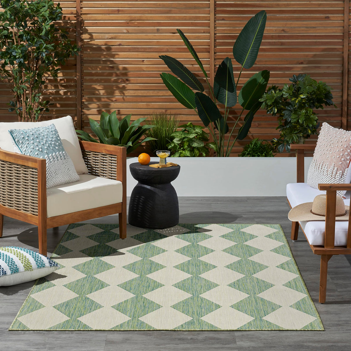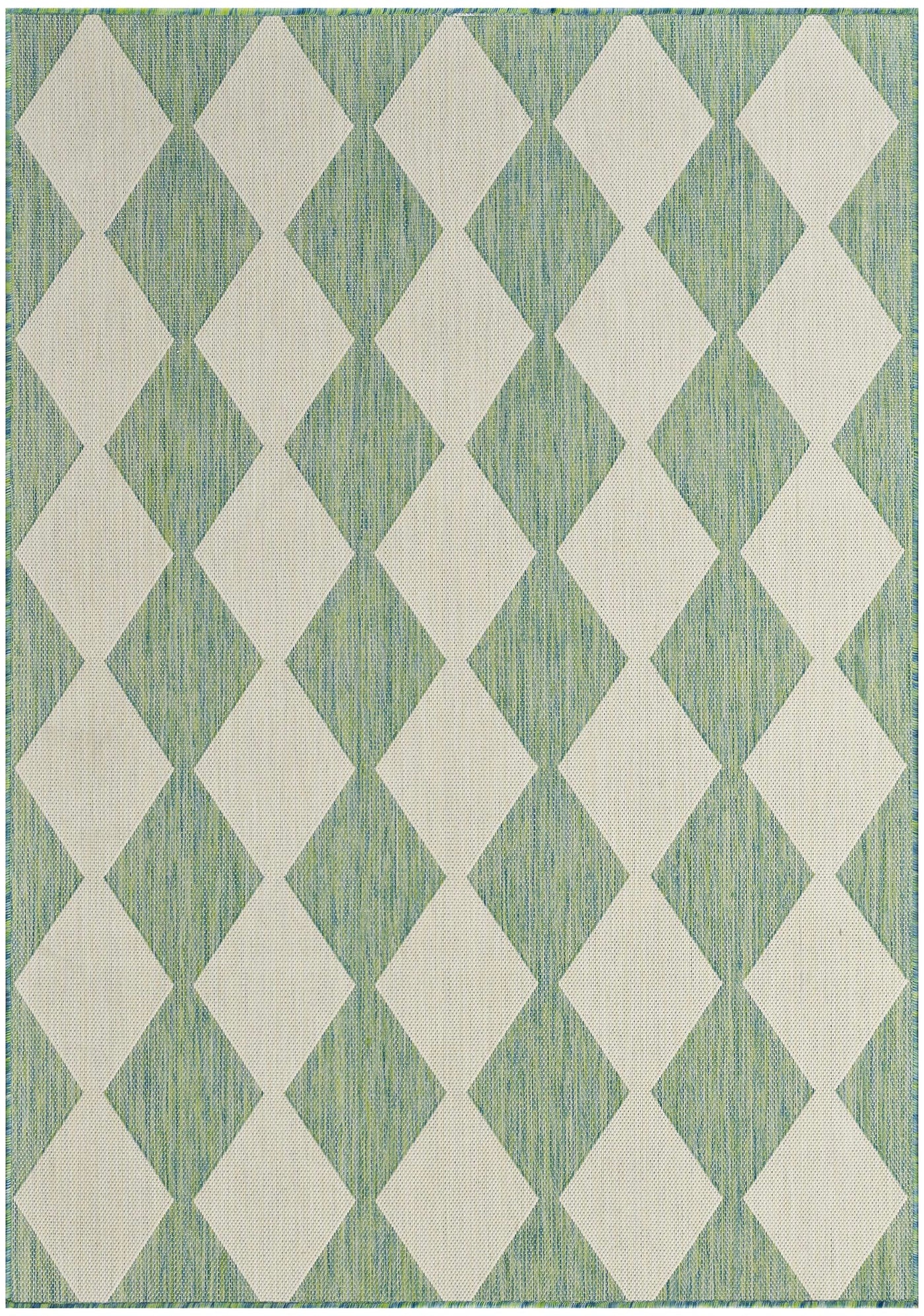 Upgrade your outdoor lifestyle with the rich, textural appeal of a Positano outdoor rug. These flatweave rugs are elegant enough for your living room or dining room, yet durable enough to enjoy outdoors on your porch, patio, or deck! Choose from a spectrum of versatile neutrals and colorful rugs that display exciting variations thanks to the space-dyed, striated yarns. Machine-made from polypropylene for easy cleaning: just hose rinse and air dry. Make a statement both inside and outside your home with this checkered diamond outdoor rug from the Positano collection. The retro tile-inspired design adds a stunning pop of pattern, boosted by a space-dyed color effect in blue and green. This versatile rug is flat woven for easy placement in all your most used rooms – from the living room, kitchen, and bathroom to the patio, backyard, or deck.