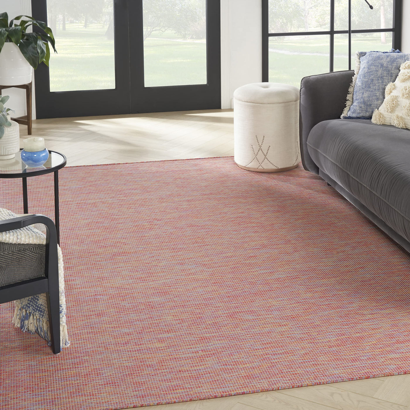 Upgrade your indoor/outdoor lifestyle with the rich, textural appeal of a Positano outdoor rug. These flatweave rugs are elegant enough for your living room or dining room, yet durable enough to enjoy outdoors on your porch, patio, or deck! Choose from a spectrum of versatile neutrals and colorful rugs that display exciting variations thanks to the space-dyed, striated yarns. Machine-made from polypropylene for easy cleaning: just hose rinse and air dry. The appealing texture of this flatweave Positano outdoor rug is made beautifully visible by the space-dyed color variations of its striated yarns. Machine-made from durable polypropylene fibers for easy-cleaning. Presented in red, blue, and yellow multicolor, this versatile design easily fits in a variety of spaces - from your outdoor patio conversation area to your living room, dining room, or kitchen.
