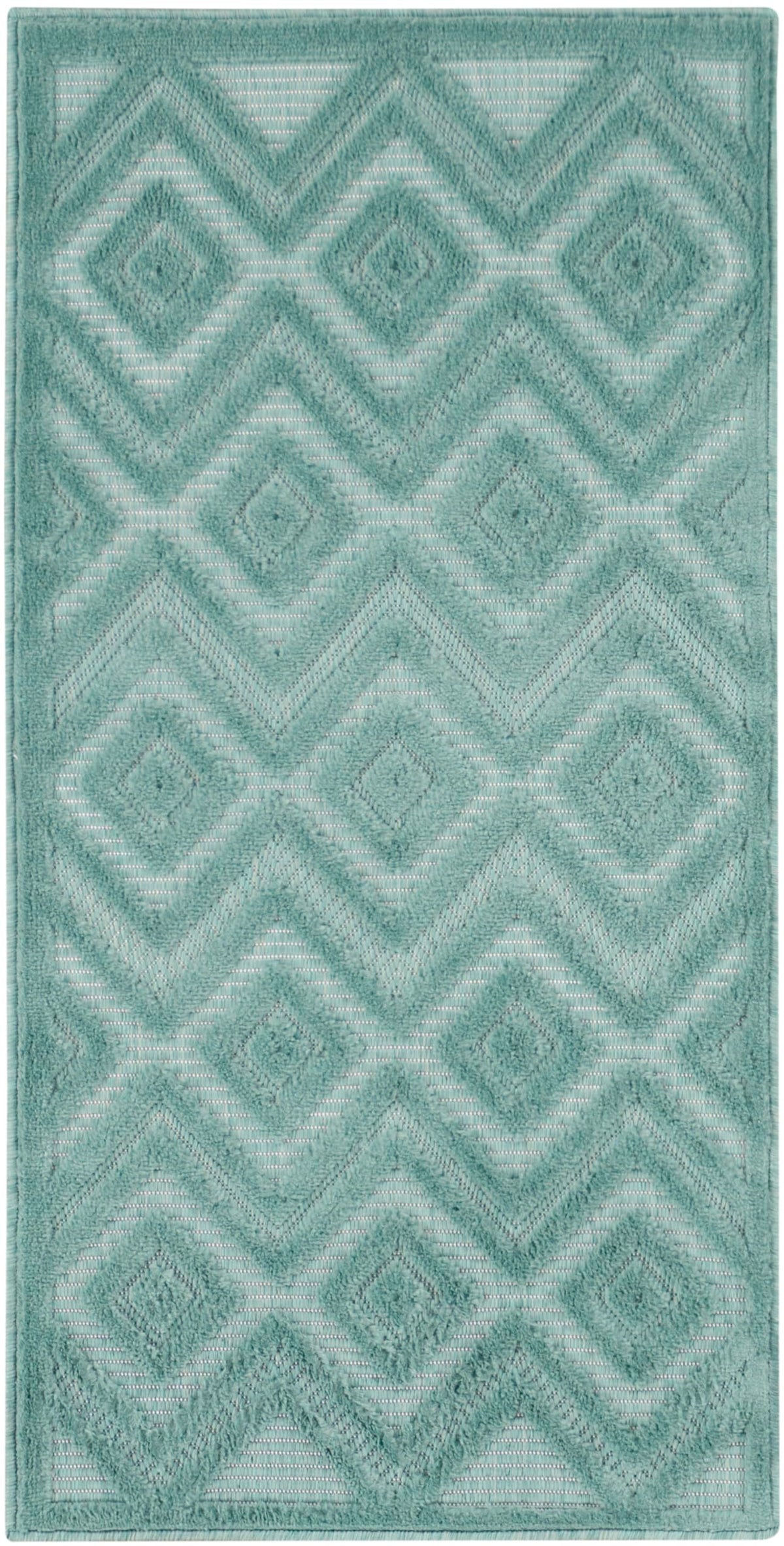 Enhance your indoor or outdoor space with the contemporary appeal of an outdoor rug from the Nourison Versatile Collection. These dynamically textured rugs feature a flatwoven ground with raised designs that feel incredibly soft to the touch, adding an instant layer of depth to just about any space – from living room and dining room to patio, porch, or deck. Machine-made from a blend of durable polypropylene and polyester fibers that are easy to clean: just hose rinse and air dry. This aqua blue and teal Nourison Versatile Collection rug brings inviting style to your favorite indoor or outdoor space. With a raised diamond design in that stands out beautifully against its flatwoven ground, this outdoor rug enhances your space with delightful texture and modern appeal. Machine-made from durable, easy-to-clean fibers, Versatile is great for high-traffic areas inside the home as well as all seasons spent outdoors.