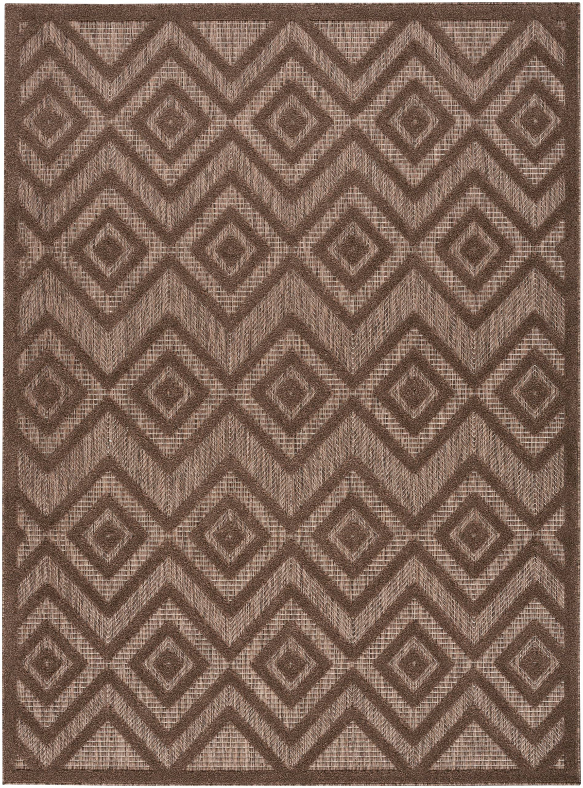 Enhance your indoor or outdoor space with the contemporary appeal of an outdoor rug from the Nourison Versatile Collection. These dynamically textured rugs feature a flatwoven ground with raised designs that feel incredibly soft to the touch, adding an instant layer of depth to just about any space – from living room and dining room to patio, porch, or deck. Machine-made from a blend of durable polypropylene and polyester fibers that are easy to clean: just hose rinse and air dry. This Nourison Versatile Collection rug brings inviting style to your favorite indoor or outdoor space. With a raised diamond design in deep earth brown tones that stands out beautifully against its flatwoven ground, this outdoor rug enhances your space with delightful texture and modern appeal. Machine-made from durable, easy-to-clean fibers, Versatile is great for high-traffic areas inside the home as well as all seasons spent outdoors.