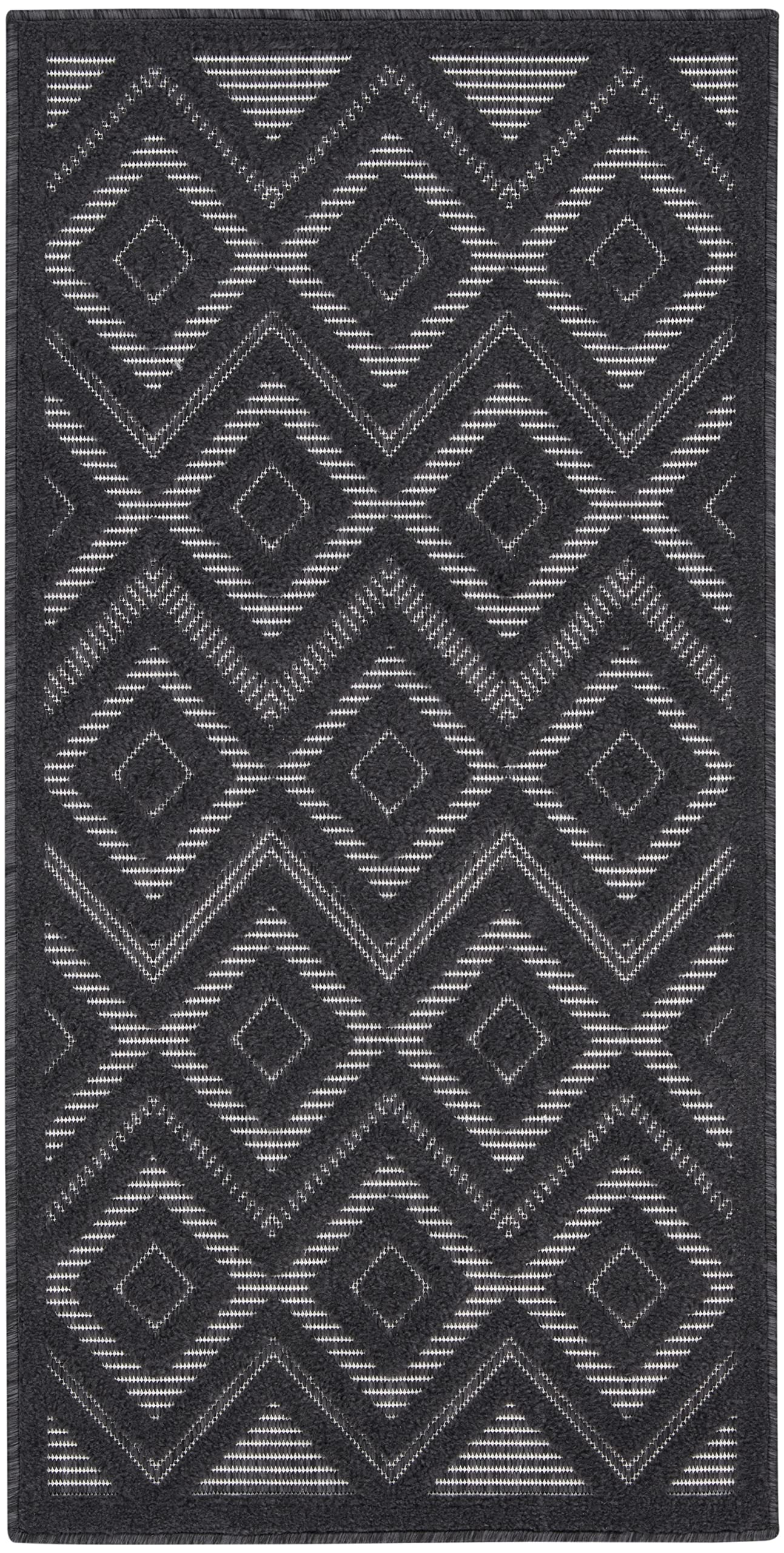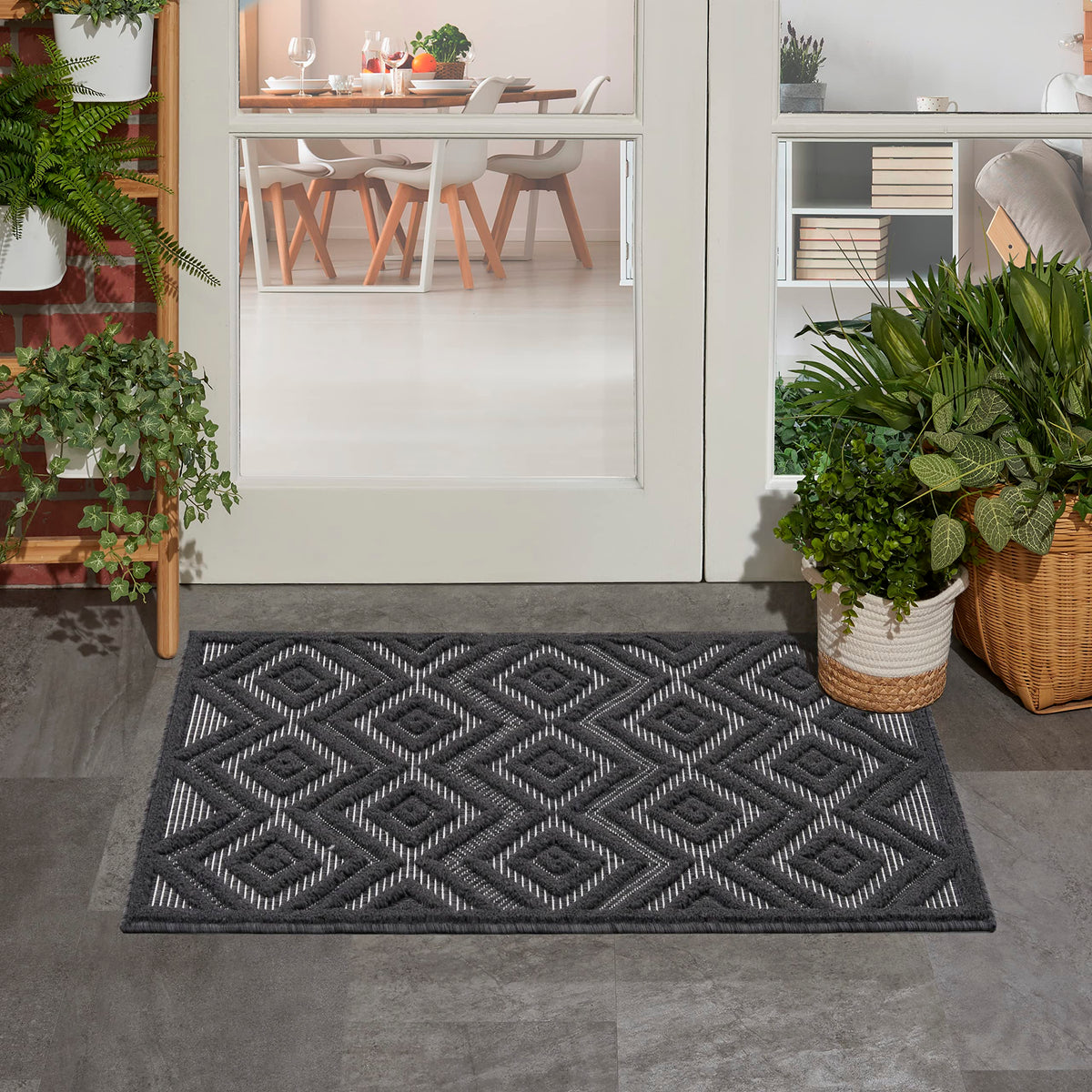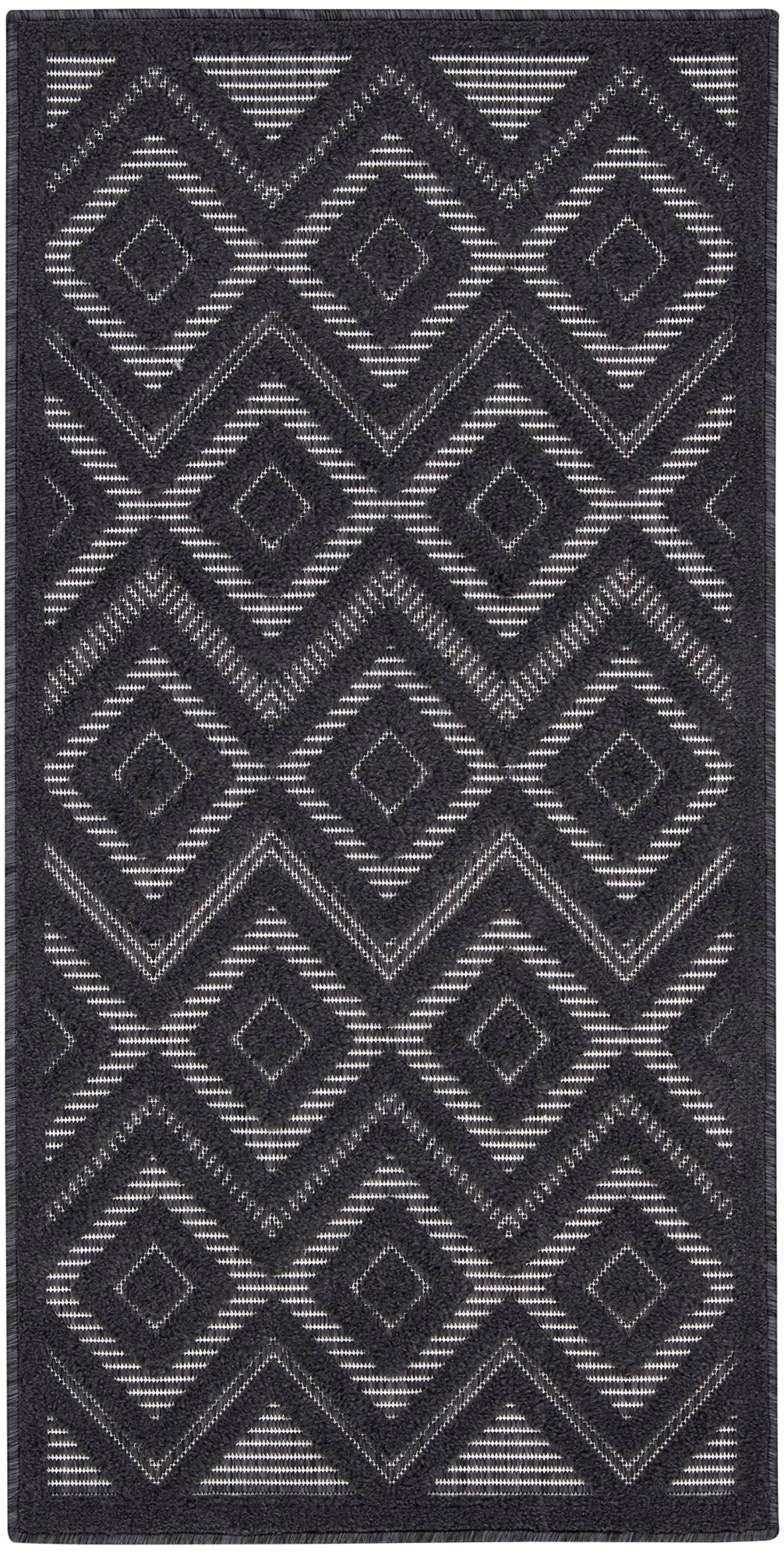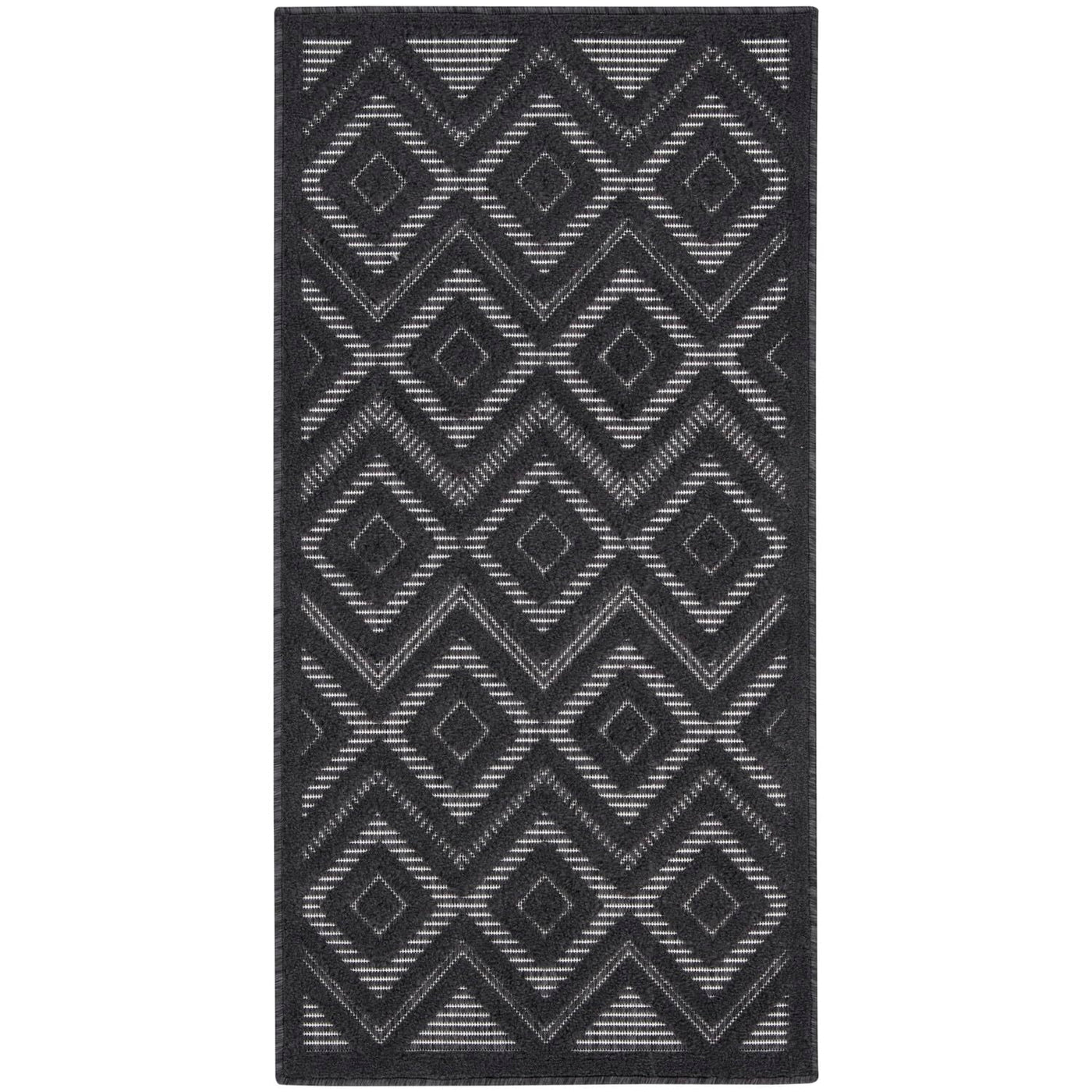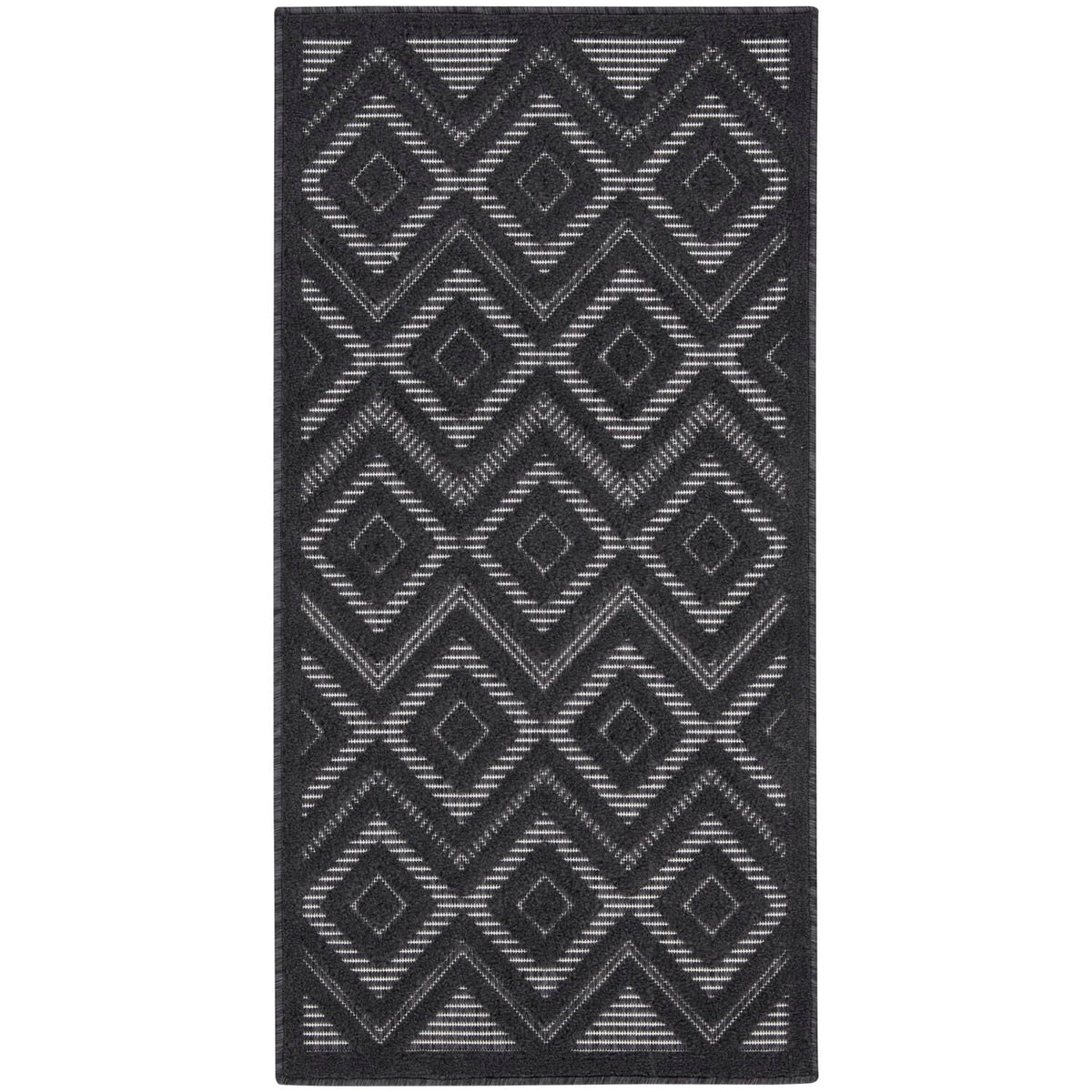 Enhance your indoor or outdoor space with the contemporary appeal of an outdoor rug from the Nourison Versatile Collection. These dynamically textured rugs feature a flatwoven ground with raised designs that feel incredibly soft to the touch, adding an instant layer of depth to just about any space – from living room and dining room to patio, porch, or deck. Machine-made from a blend of durable polypropylene and polyester fibers that are easy to clean: just hose rinse and air dry. This charcoal grey and black Nourison Versatile Collection rug brings inviting style to your favorite indoor or outdoor space. With a raised diamond design that stands out beautifully against its flatwoven ground, this outdoor rug enhances your space with delightful texture and modern appeal. Machine-made from durable, easy-to-clean fibers, Versatile is great for high-traffic areas inside the home as well as all seasons spent outdoors.