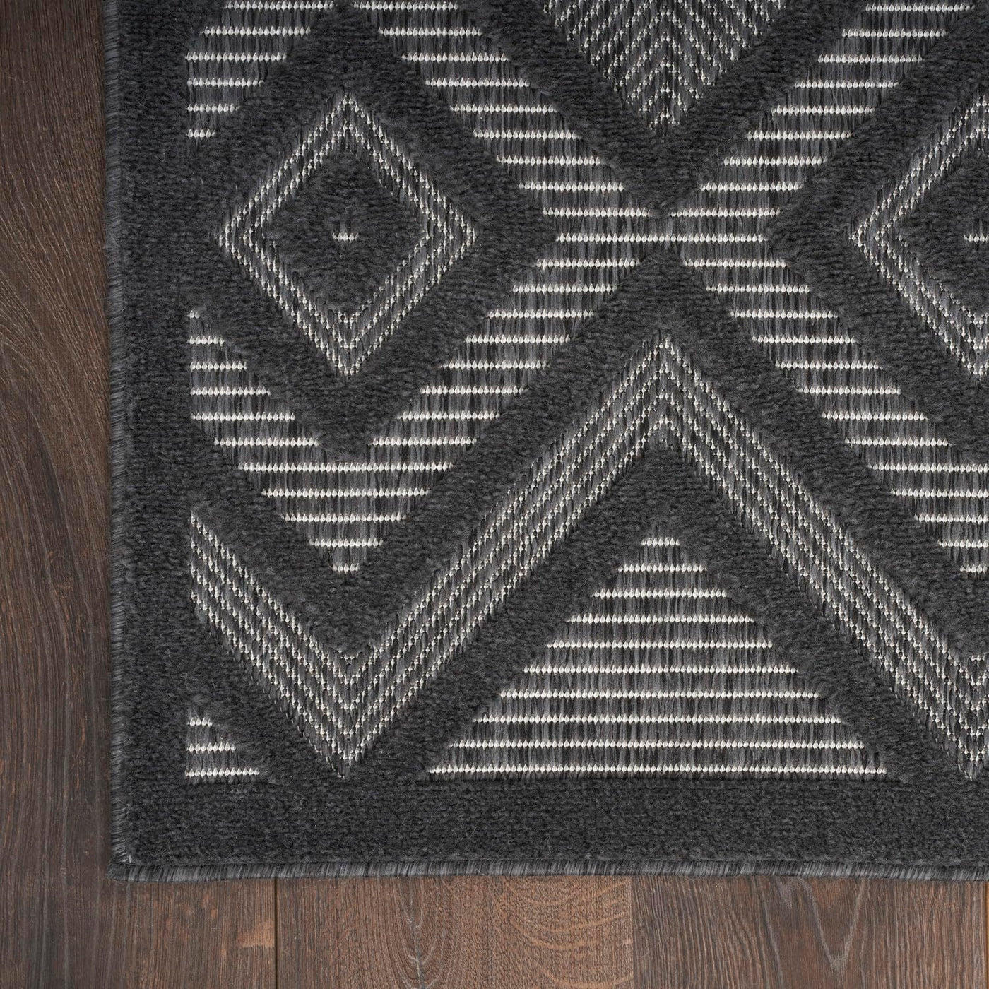 Enhance your indoor or outdoor space with the contemporary appeal of an outdoor rug from the Nourison Versatile Collection. These dynamically textured rugs feature a flatwoven ground with raised designs that feel incredibly soft to the touch, adding an instant layer of depth to just about any space – from living room and dining room to patio, porch, or deck. Machine-made from a blend of durable polypropylene and polyester fibers that are easy to clean: just hose rinse and air dry. This charcoal grey and black Nourison Versatile Collection rug brings inviting style to your favorite indoor or outdoor space. With a raised diamond design that stands out beautifully against its flatwoven ground, this outdoor rug enhances your space with delightful texture and modern appeal. Machine-made from durable, easy-to-clean fibers, Versatile is great for high-traffic areas inside the home as well as all seasons spent outdoors.