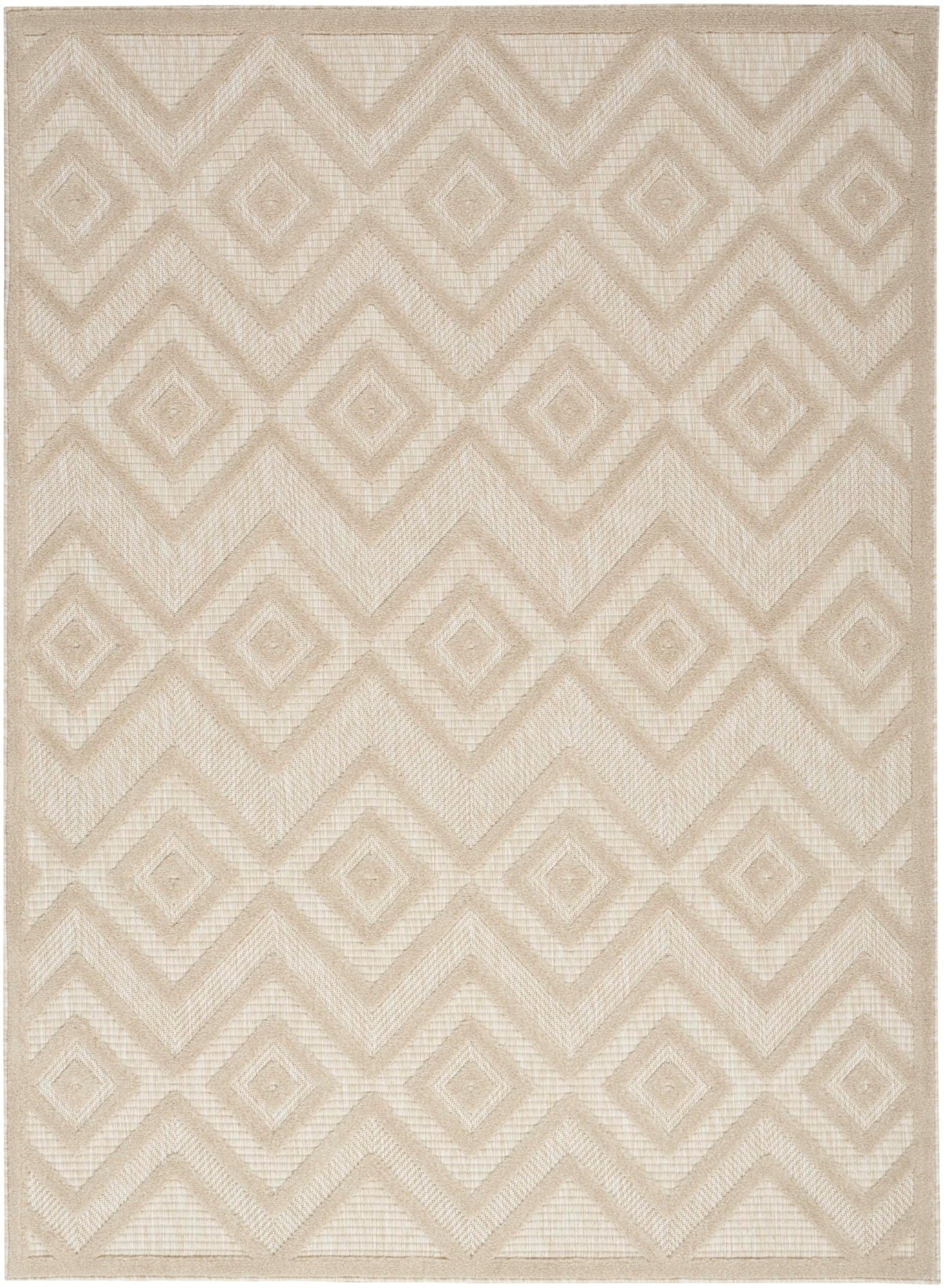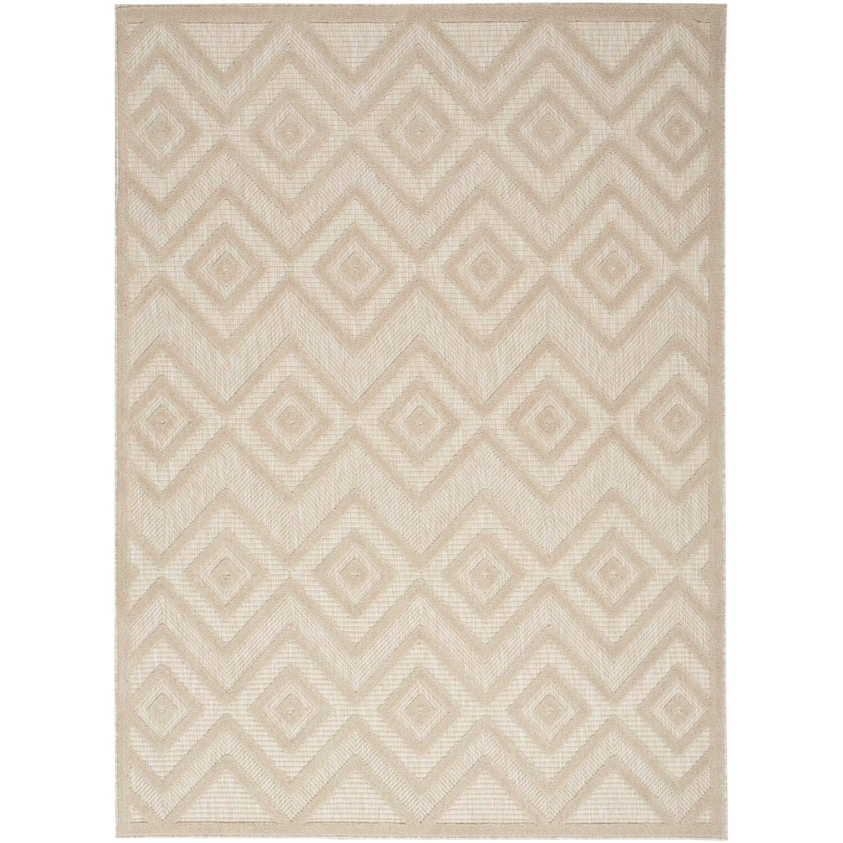 Enhance your indoor or outdoor space with the contemporary appeal of an outdoor rug from the Nourison Versatile Collection. These dynamically textured rugs feature a flatwoven ground with raised designs that feel incredibly soft to the touch, adding an instant layer of depth to just about any space – from living room and dining room to patio, porch, or deck. Machine-made from a blend of durable polypropylene and polyester fibers that are easy to clean: just hose rinse and air dry. This Nourison Versatile Collection rug brings inviting style to your favorite indoor or outdoor space. With a raised diamond design in earthy cream tones that stands out beautifully against its flatwoven ground, this outdoor rug enhances your space with delightful texture and modern appeal. Machine-made from durable, easy-to-clean fibers, Versatile is great for high-traffic areas inside the home as well as all seasons spent outdoors.