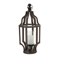 Candle Holder 9''L x 22.5''H Wood/Glass Embellish your home with this stunning Open Wooden Lantern. Featuring an open design and quality wooden frame, this piece would make a great addition to your vintage, rustic, or industrial style of decor. The delicate glass vase insert is the perfect finishing touch. Illuminate the piece with a real wax or LED candle pillar. Measures 9 x 9 x 22.5 Primary Materials: Wood, Glass Reccommended for indoor or outdoor covered use only Candles sold separately