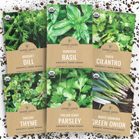 Basic Herb Organic Seed Variety Packno Vegetable Garden Is Complete Without An Herb Garden To Accompany It. This Collection Of Heirloom And Open Pollinated Varieties Give You The Essential Herbs You'Ll Need For Everyday Cooking. Well Adaptable To Backyard Gardens, Container Gardening, Hydroponics Systems, Smart Gardens And More. Start Growing Today!Contains The Following Individual Organic Seed Packets:Bouquet Dill: Season Long Producer. Harvest The Leaves, Flowers, And Seeds Too!Genovese Basil: Dark Green Intensely Flavorful Greens. A Must Have For Pesto.Santo Cilantro: Bright And Zesty Flavor In The Leaves, Stems, And Seeds.English Thyme: Earthy Flavor With Mild Spice. Very Aromatic Herb That Can Be Used Fresh Or Dried.Italian Giant Parsley: Very Large Flavorful Leaves On Tall Upright Stems. White Ishikura Green Onion: Traditional Japanese Heirloom Variety With Long And Straigtht White Tipped Onions. The Sweet Yards Guarantee:Were A Usda Certified Organic Seed Company Focused On Providing The Highest Quality Seeds To Gardeners Across The Usa. Were Confident In Our Seeds, And Want You To Feel The Same Way. If You Have Any Issues With Our Seeds, We'Ll Offer You A Complete Refund Or Replacement, No Questions Asked Within 120 Days.
