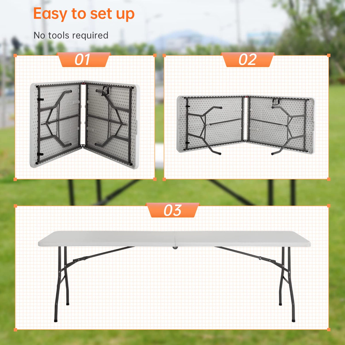 The 8Ft Picinic Table Fold Up For Easy Storage And Have A Nice Carrying Handle. Easy To Set Up You Pulled Them Out Of The Box And Opened The Up. They Are Good Heavy Duty Plastic And As Long As Taken Care Of Will Last You For Many Years To Come. You Must Be Talking About Buying A Couple More To Have On Hand And For More Room For Food And People.
