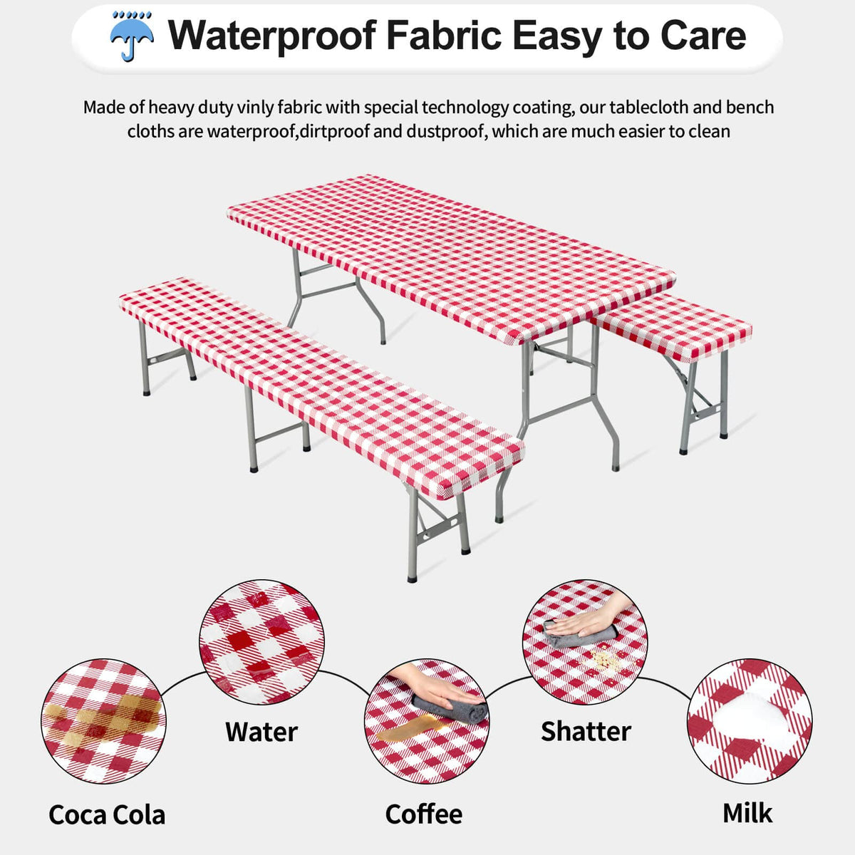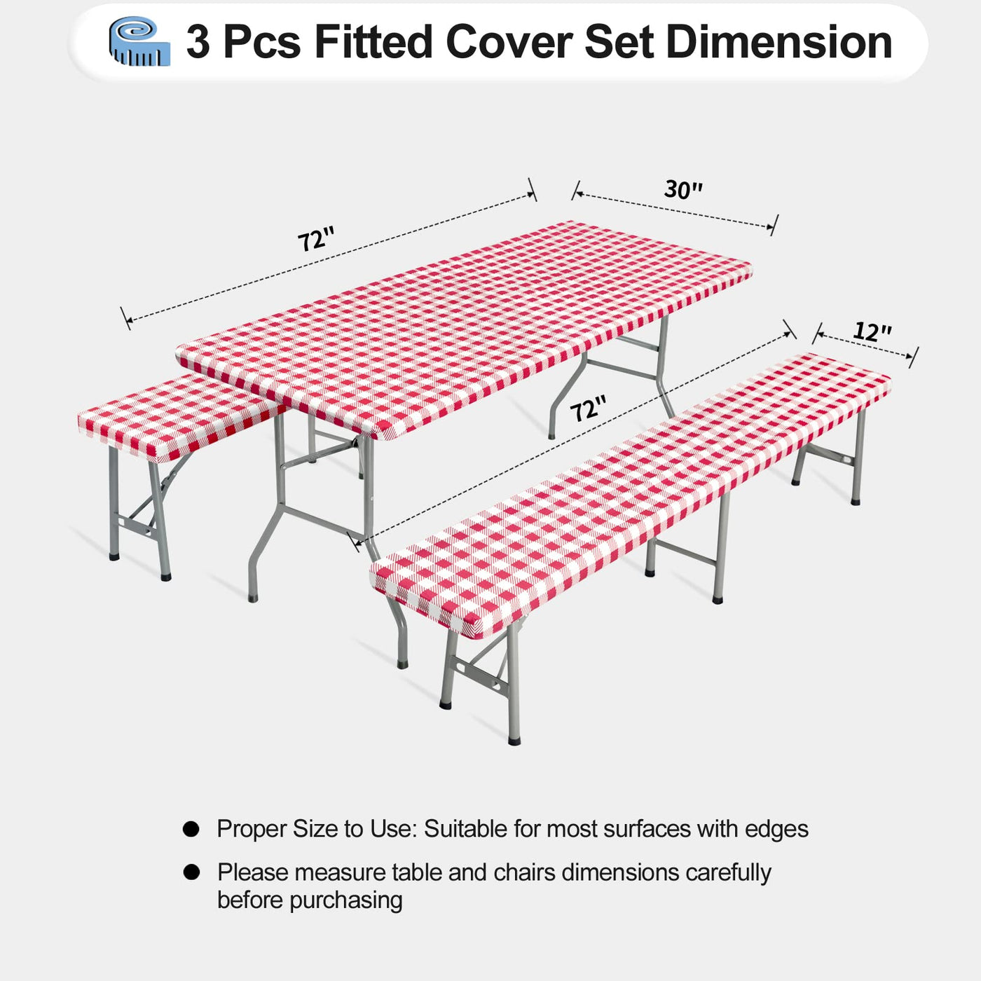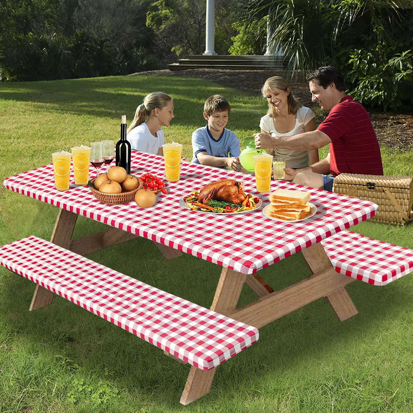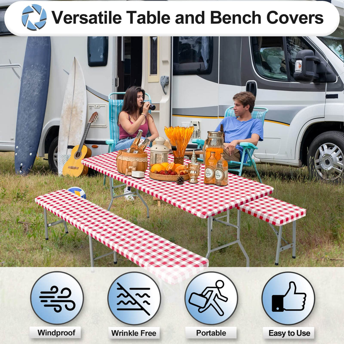 Outdoorlines Vinyl Fitted Picnic Table Cover With Bench Covers - Waterproof Camping Tablecloth For Picnic Table, Elastic Picnic Table Covers For Outdoor, Camping (Checkered Red 72X30 Inch, 3 Pcs)