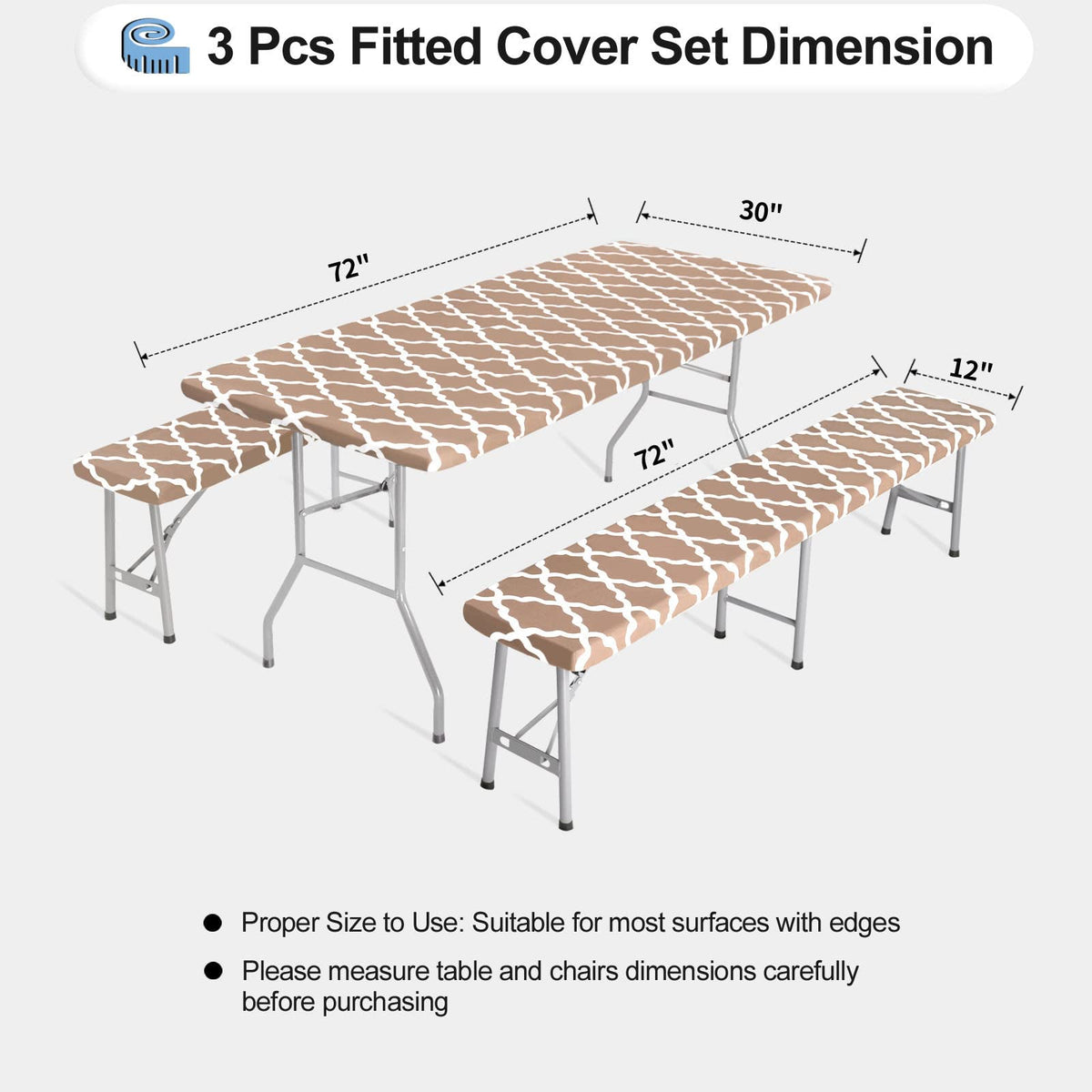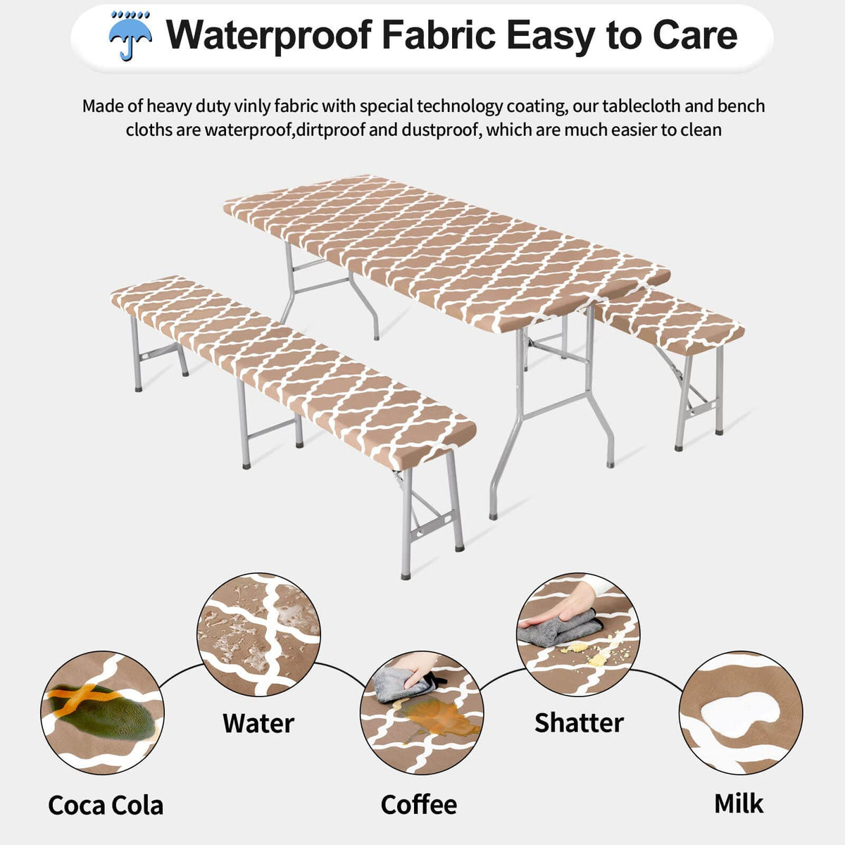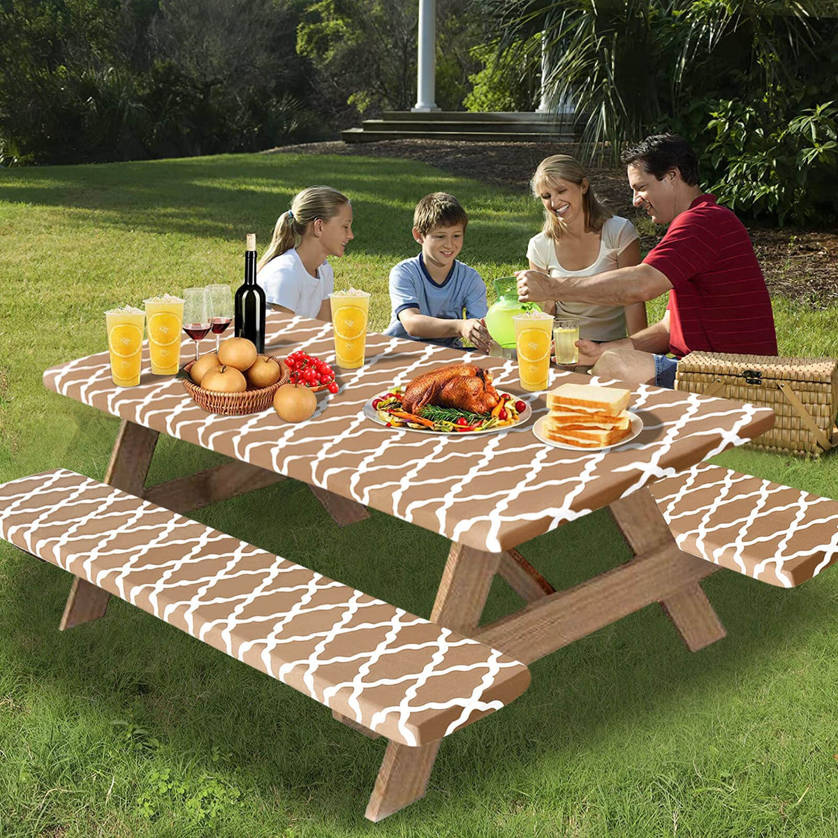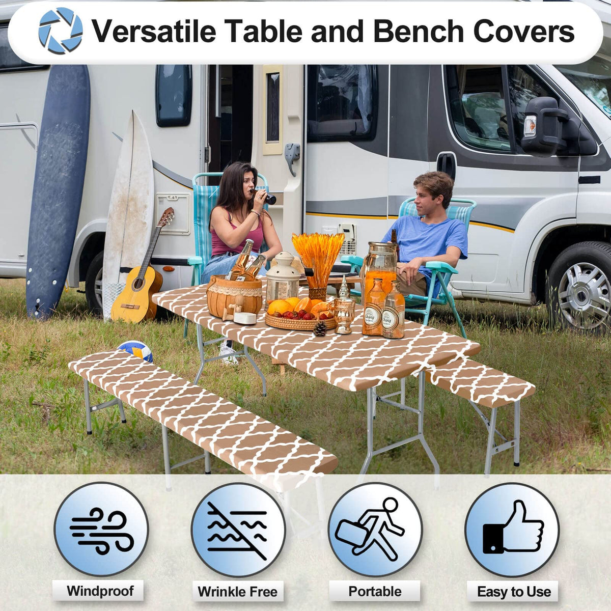 Outdoorlines Vinyl Fitted Picnic Table Cover With Bench Covers - Waterproof Camping Tablecloth For Picnic Table, Elastic Picnic Table Covers For Outdoor, Camping (Moroccon Camel 72X30 Inch, 3 Pcs)
