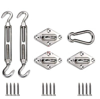 Q: What is included in the hardware kit for shade sail installation?A: The hardware kit includes one turnbuckle, three diamond eyepads, and one carabiner/snap hook, providing everything you need to securely hang your shade sail.