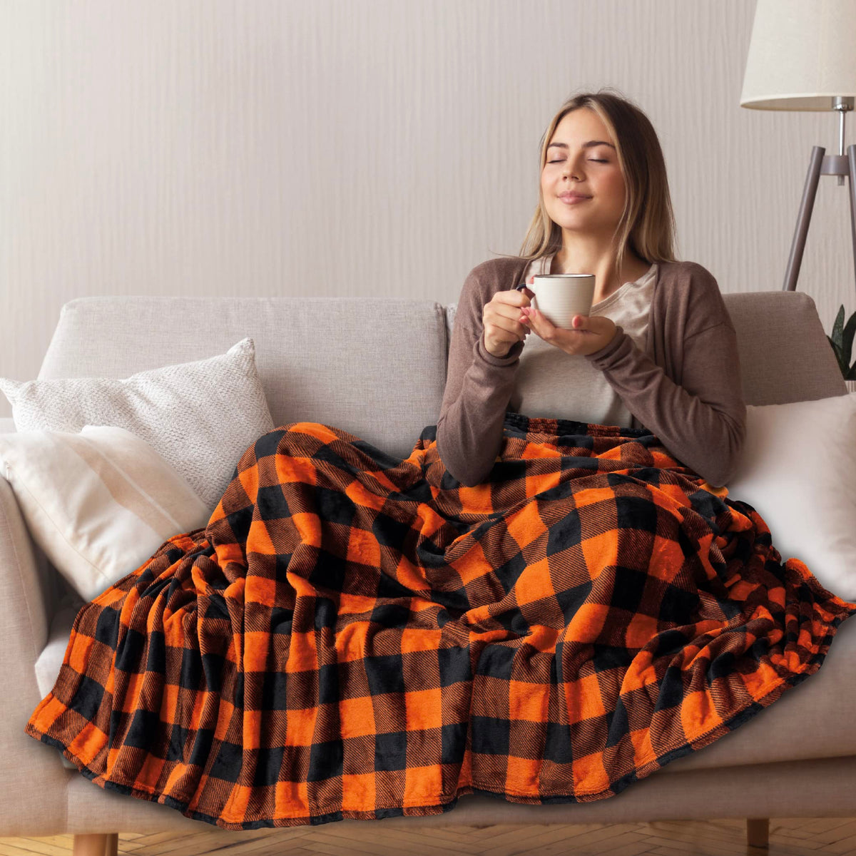 Pavilia Black And Orange Buffalo Plaid Fleece Throw Blanket For Couch, Soft Halloween Flannel Blanket For Sofa, Orange Checkered