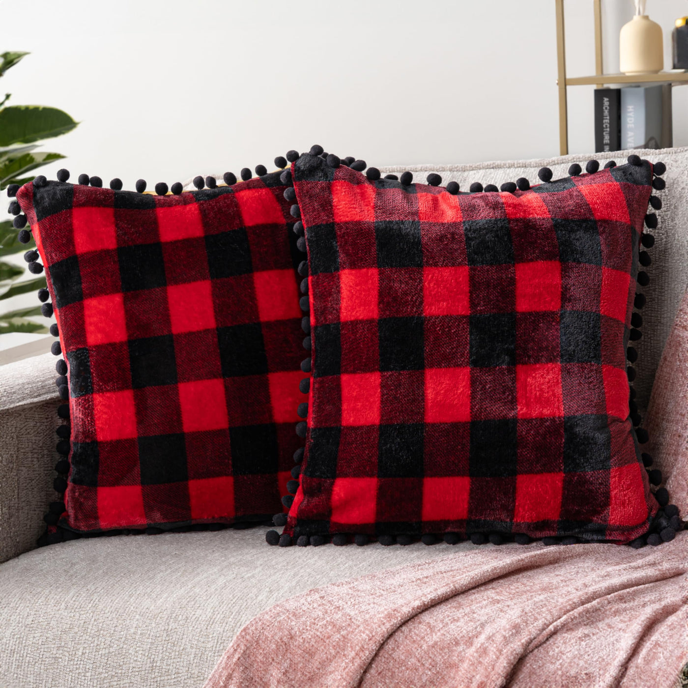 Pavilia Plaid Red Black Throw Pillow Covers Pom Pom 18X18 Set Of 2, Decorative Pillow Cases For Bedroom Aesthetic, Buffalo Check
