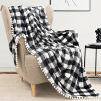 Pavilia Pom Pom Blanket Throw Twin, Buffalo Plaid White Black Check | Soft Fleece Pompom Fringe Blanket Couch Bed Sofa | Decorat