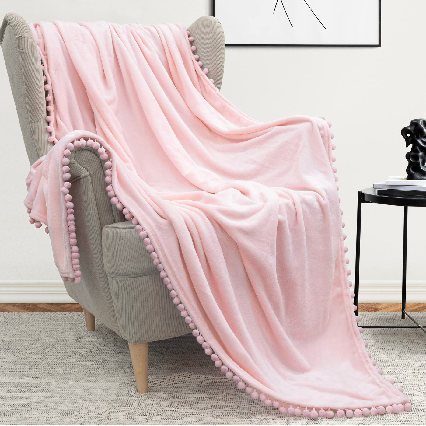 Pavilia Pom Pom Blanket Throw Twin, Light Pink | Soft Fleece Pompom Fringe Blanket For Couch Bed Sofa | Decorative Cozy Plush Wa