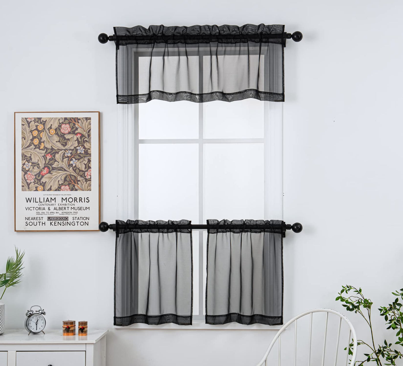Pi Black Sheer Tier Curtains 24 Inch Length,Short Half Window Curtains For Kitchen/Bathroom Rod Pocket 2 Panels (Black,W25Xl24)