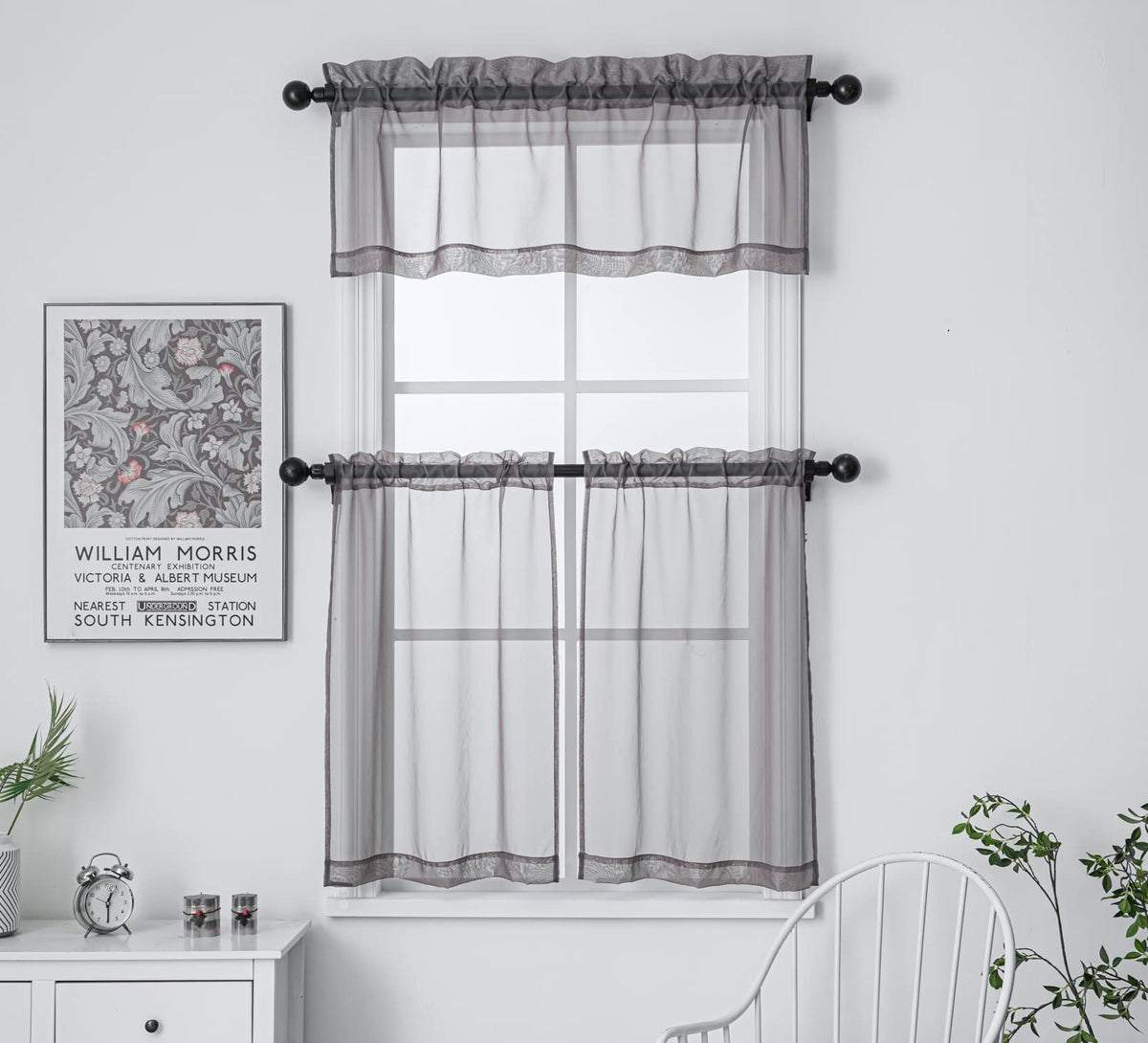Pi Grey Sheer Tier Curtains 36 Inch Length,Voile Café Curtains Kitchen Tiers Basement Rod Pocket 2 Panels (Dark Grey, W25Xl36)