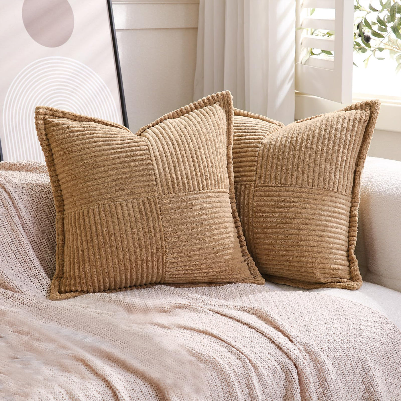 Puncuntex Corduroy Throw Pillow Covers Set Of 2 Boho Decorative Khaki 22?22 Inch,Super Soft Pillowcase Cozy Striped Texture Cush