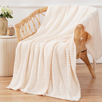 Puncuntex Flannel Fleece Throw Blanket Cream White 50'' 60'',Super Soft Plush Cozy Blanket With 3D Jacquard Square Grid Design