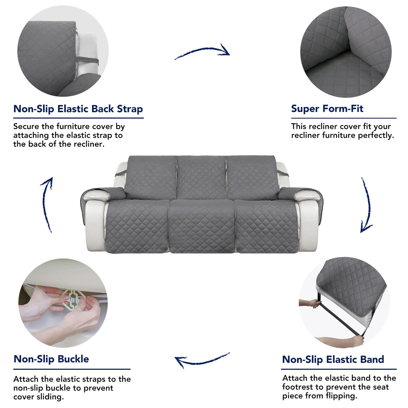 Why Buy A Recliner&Nbsp;Furniture Cover? Because Your&Nbsp;3 Seat&Nbsp;Recliner&Nbsp;Is Probably The Most Used - And Abused - Piece Of Furniture In Your Home. A Purefit Recliner&Nbsp;Cover Not Only Protects Your Furniture, But Also Transform An Old, Worn Out Recliner&Nbsp;Into The Stunning Centerpiece Of Your Room. With Our Reversible Design, Change Styles And Colors Without Buying A New Recliner. &Nbsp; The 3 Layers Cushioning Quilted Reversible Fabric Our Reversible 3 Seat Recliner&Nbsp;Covers Are Made From Tear Resistant Soft Quilted Microfiber Poly Fabric With Thick Poly Filling For Cushioning Comfort. With Special Seaming To Prevent Leakage And Water Resistant Treatment, This Furniture Protector Protects Furniture From Spills And Accidents. &Nbsp; Non-Slip Recliner&Nbsp;Cover That Actually Stays In Place Our 3 Seat Recliner&Nbsp;Protector Covers Are Meticulously Engineered So That They Stay In Place! Our Non-Slip Recliner Furniture Slip Covers Feature Non-Slip Buckles, Elastic Strap On The Back Of Sofa And Feature Elastic Band At Bottom Of Cover On The Footrest,&Nbsp;Elastic Loop At Seat Back Side To Ensure They Will Stay Tight With No Snag, No Wrinkling,&Nbsp;Shifting. &Nbsp; Will This Fit My Recliner? Our Form Fit Recliner Furniture Covers Are Meticulously Designed And Ready-Made To Fit A Variety Of Recliner Styles, But Feel Free To Use These Guidelines To Ensure A Good Fit. 3 Seat Recliner Fits Recliner&Nbsp;With Seats Width 69'' (Each&Nbsp;Piece Seat Width 23'').