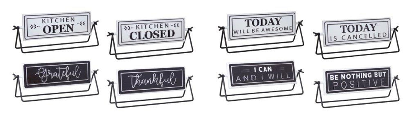 Reversable Sign w/Stand (4 Asst) 12.75''L x 4.75''H Iron Decorate your kitchen and living space with this fun set of Reversible Signs on Stands. Featuring four assorted sentiments, the classic black and white color scheme paired with the modern design makes this piece a perfect addition to any style of decor. Sentiments include ''Grateful/Thankful'', ''Kitchen is Open/Closed'', ''Today Will be Awesome/Today is Cancelled'', and ''I can and I Will/Be Nothing But Positive. Featured in Melrose International's Simple Country'' collection. Measures 12.75 x 3.25 x 4.75 each Primary Materials: Iron Metal Reccommended for indoor use only