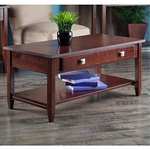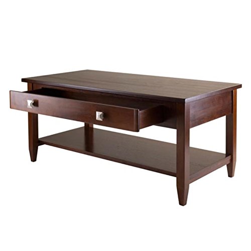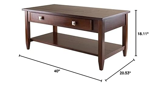 Richmond Coffee Table has clean profile, perfect for living or family room.This compact console offers layers of function with one larger drawer and a bottom shelf.Overall table size is 40"W x 20.53"D x 18.11"H. Table Top Dimension is 40"W x 20"D.Drawer inside dimension is 28.82"W x 11.29"D x 2.59"H. Shelf size is 37.95"W x 15.27"D.Clearance from apron to shelf is 7.87".Constructed with combination of solid and composite wood in warm Antique Walnut finish.Assembly Required. . Dimension: 40" W x 20.53" D x 18.11" H, Weight: 43.75