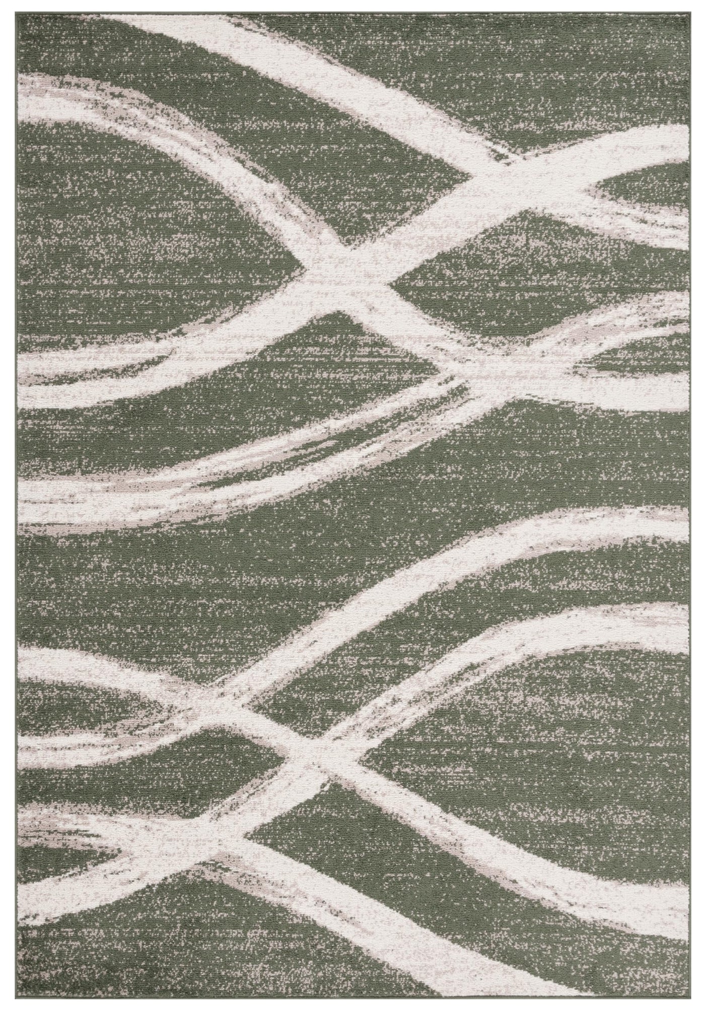 Q: What style does the SAFAVIEH Adirondack Collection Area Rug feature?A: The rug showcases a modern wave design in dark green and ivory, which beautifully enhances any room's decor. Its trendy style combines rustic lodge aesthetics with contemporary flair, making it a striking addition to living rooms, bedrooms, and dining areas.