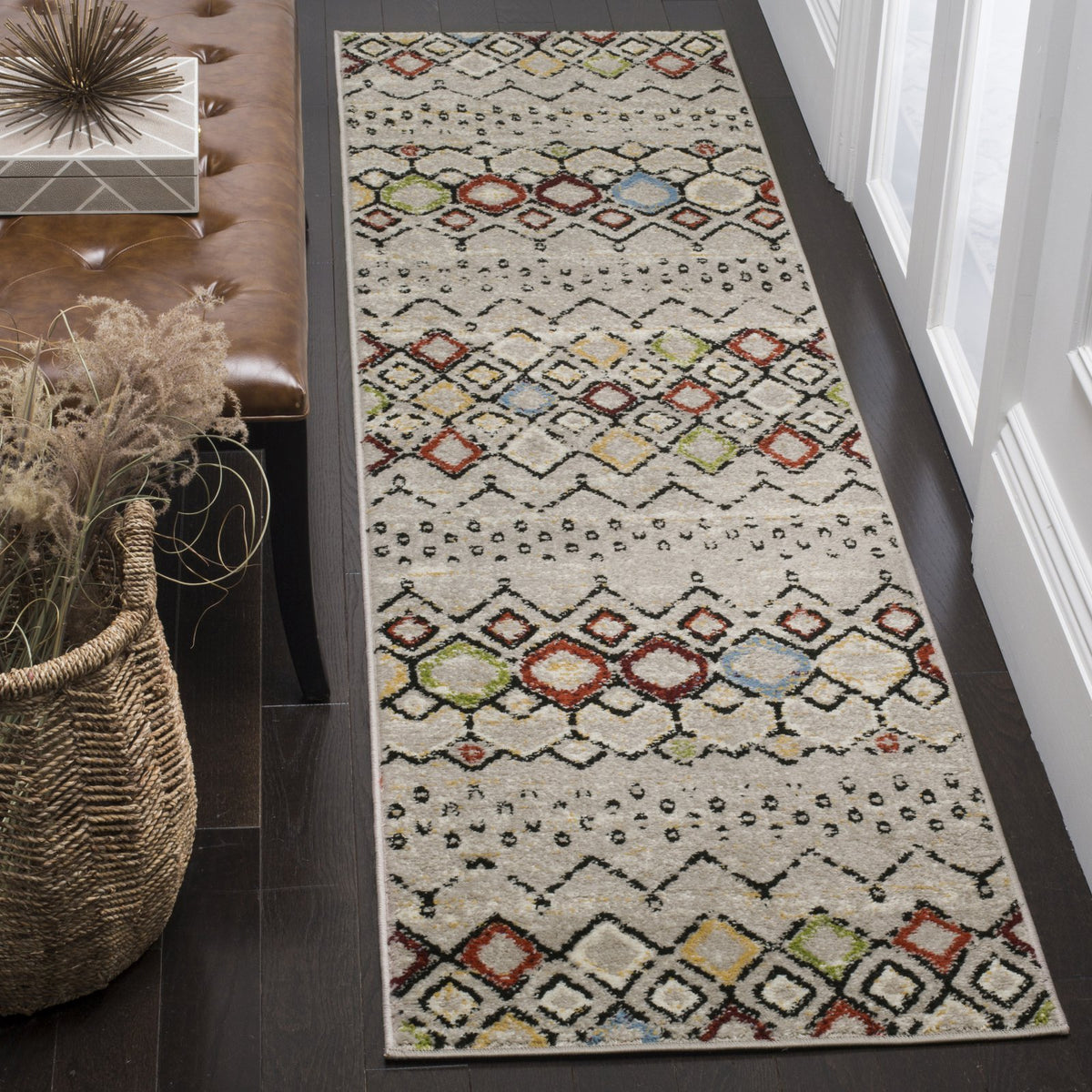 Q: What style does the SAFAVIEH Amsterdam Collection Area Rug feature?A: This rug features a trendy Moroccan boho design, which adds a stylish touch to any room, from the living room to the bedroom or even a home office.