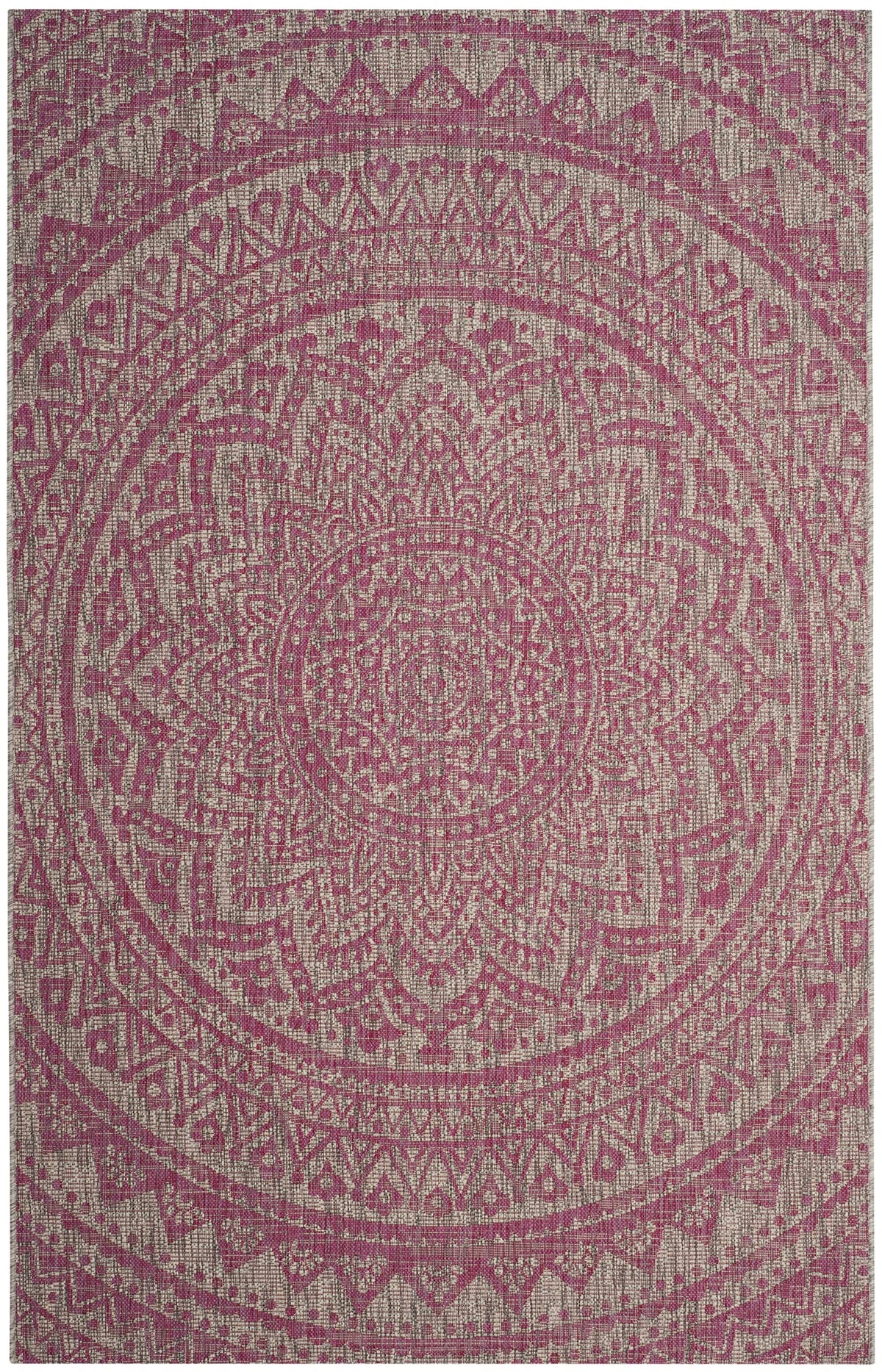 Safavieh' s Courtyard Collection is inspired by timeless designs crafted with the softest polypropylene available. This rug is crafted using a power loomed construction and features a main accent color of natural. Perfect for any backyard, patio, deck or poolside, this rug will instantly turn your outdoor area into a resort-style entertaining space. Finely crafted for seasons in the sun and years of open-air gatherings, the Courtyard rug instantly elevates any interior or exterior décor to a space of visual inspiration. More than a decorative enhancement, this rug is both and - to ensure carefree maintenance. With its style, practicality, and transitional decorating options, this rug extends an open invitation to gather and may just spark impromptu parties. Primary Color: Terracotta Pile Height: 0.25 inches Material: Polypropylene Style: Contemporary Construction: power loomed Rug Type: Indoor/Outdoor Feature: Latex Free Rug Dimensions: 6'7' x 9'6'