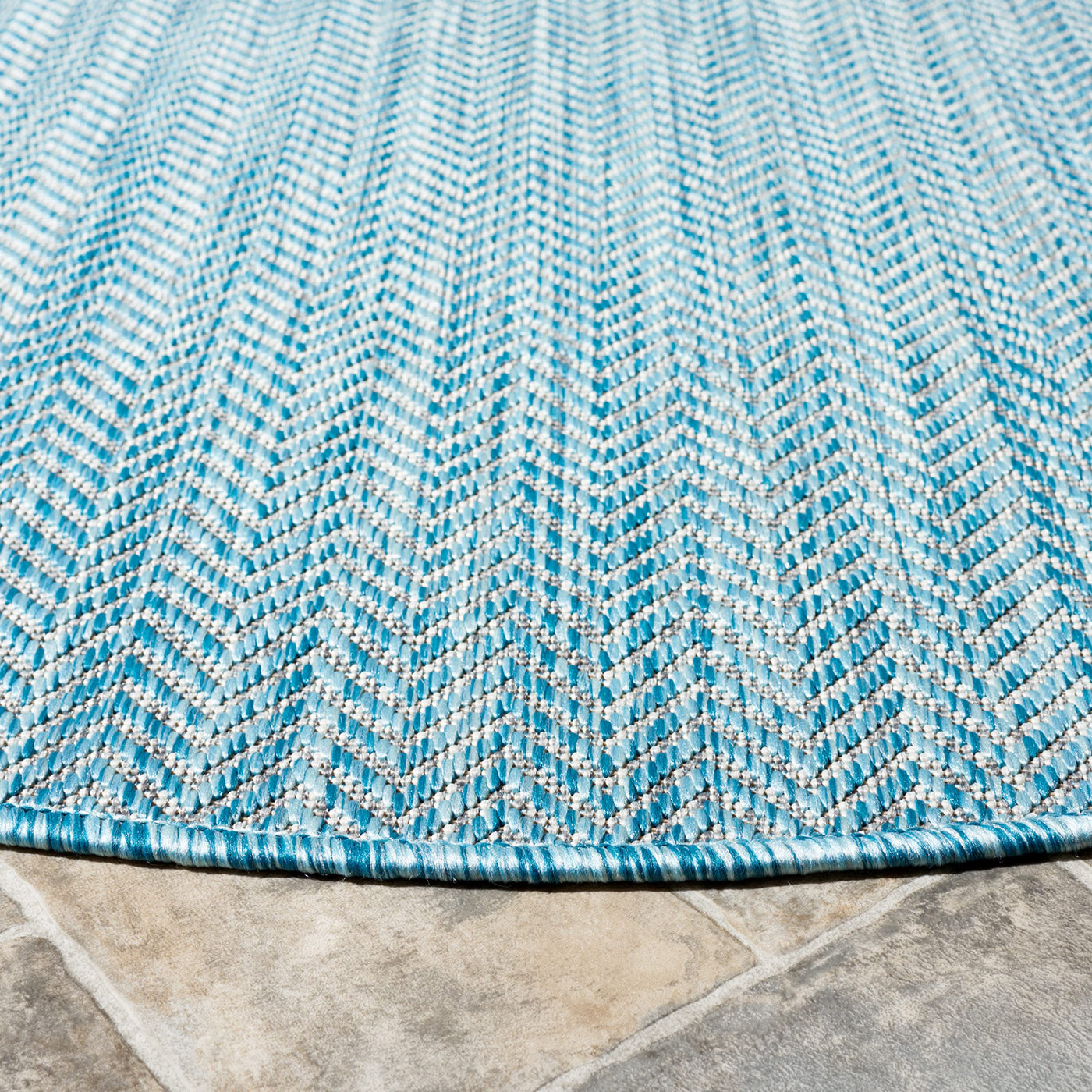 Q: How do I clean and maintain the Aqua/Grey round rug?A: Maintaining the Aqua/Grey round rug is easy. Regular vacuuming is recommended, and for deeper cleaning, you can rinse it with a garden hose using soapy water. Ensure the rug air dries completely before storing it away when not in use.