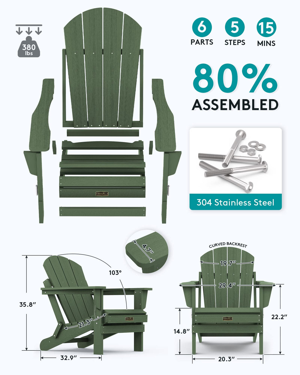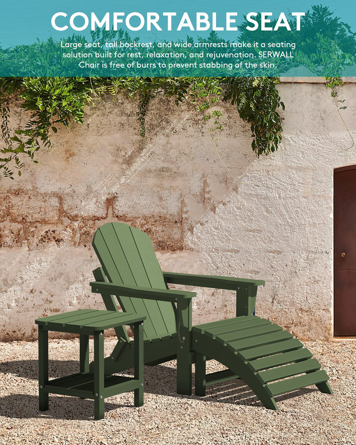 Folding Design: Are You Still Struggling With The Size Of Adirondack Chair? This Adirondack Chair Can Be Stored Away Easily. Buy Serwall Folding Adirondack Chairs To Make More Room For Your Home! Buy Serwall Outdoor Table To Match The Chair(Asin:B09M6H2Dvx). Buy Serwall Ottoman: (Asin:B0Blxn62Cm). | Why Choose Serwall? Material Of Serwall- Hips: High Impact Polystyrene (Poly Lumber), Looks And Feels Like Real Wood, Composite, Weather Resistant, Low Maintenance, More Durable Than Wood, Surface Is Smoother Than Hdpe Material. 22 Inch Armrest Width And 380 Lbs Load Capacity Can Make Anyone Of Any Body Type Feel Really Comfortable. | Product Dimensions: 29.4'W X 32.9'D X 35.8'H, The Seat Width Of The Serwall Classic Adirondack Chair Is 2 Inches Wider Than The Average Chair In The Market, The Outdoor Adirondack Chair Is The Perfect Companion For Chaise Lounge Rocking Chairs And Outdoor Patio Furniture. | Weather Resistant And Fade-Proof: Made Of High-Quality Hips Material, Serwall Adiorndack Chair Incorporates Advanced Color Retention Technology That Ensures The Chair'S Durability And Resistance To Fading, Splitting, Cracking, Chipping, Peeling Or Rotting When Exposed To Harsh Weather Conditions. | Easy To Assemble: Partial Assembly Required, Hassle Free. Just Tighten The Screws And Splice Parts According To The Instructions, With 6 Pieces, 5 Steps, 15 Minutes, You Can Own A Durable Folding Adirondack Chair. | Guarantee: We Want Our Customers To Be 100% Happy And Satisfied With Serwall Adirondack Chair - You Can Always Come To Us For Any Product Issue And Product Care At Our Amazon Store, We Are Committed To Satisfying Our Customers. | Classic Design: Classic And Versatile Appearance, Making This Chair Perfect For Your Home Or Garden. | Strength And Durability: The Hips Material- Toughness Is About Four Times Higher Than Ordinary Ps, With Better Impact Strength. The Melting Temperature Of Ps Is 150 ~ 180°C. Serwall Composite Adirondack Chair Is Subject To A Variety Of Climate Changes Including Strong Wind, Sun Exposure. | Slatted Design: Slatted Backrest And Seat Sheds Rainwater And Dries Quickly, Spacious Armrests For Comfortable Sitting Experience. Ergonomic Structure With Curved Backrest Brings For You More Comfortable Seating Experience. | Comfortable Seat: Large Seat, Tall Backrest, And Wide Armrests Make It A Seating Solution Built For Rest, Relaxation, And Rejuvenation. Serwall Chair Is Free Of Burrs To Prevent Stabbing Of The Skin. And The Exquisite Connection Between Panels Is Firmly Fixed By The Screws To Ensure That It Won’T Easily Wobble Or Fall Apart.