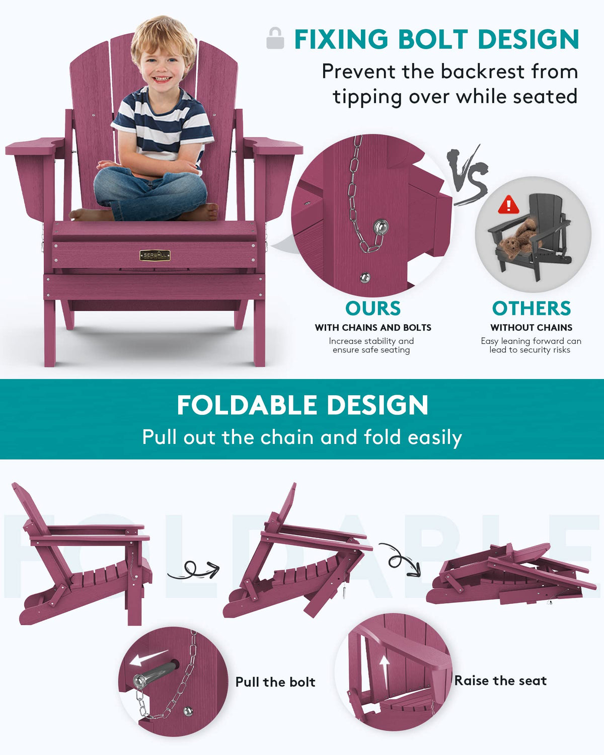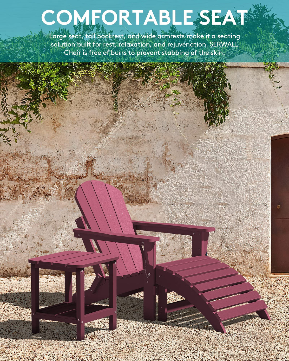 Folding Design: Are You Still Struggling With The Size Of Adirondack Chair? This Adirondack Chair Can Be Stored Away Easily. Buy Serwall Folding Adirondack Chairs To Make More Room For Your Home! Buy Serwall Outdoor Table To Match The Chair(Asin:B09M6H2Dvx). Buy Serwall Ottoman: (Asin:B0Blxn44Cm). | Why Choose Serwall? Material Of Serwall- Hips: High Impact Polystyrene (Poly Lumber), Looks And Feels Like Real Wood, Composite, Weather Resistant, Low Maintenance, More Durable Than Wood, Surface Is Smoother Than Hdpe Material. 22 Inch Armrest Width And 380 Lbs Load Capacity Can Make Anyone Of Any Body Type Feel Really Comfortable. | Product Dimensions: 29.4'W X 32.9'D X 35.8'H, The Seat Width Of The Serwall Classic Adirondack Chair Is 2 Inches Wider Than The Average Chair In The Market, The Outdoor Adirondack Chair Is The Perfect Companion For Chaise Lounge Rocking Chairs And Outdoor Patio Furniture. | Weather Resistant And Fade-Proof: Made Of High-Quality Hips Material, Serwall Adiorndack Chair Incorporates Advanced Color Retention Technology That Ensures The Chair'S Durability And Resistance To Fading, Splitting, Cracking, Chipping, Peeling Or Rotting When Exposed To Harsh Weather Conditions. | Easy To Assemble: Partial Assembly Required, Hassle Free. Just Tighten The Screws And Splice Parts According To The Instructions, With 6 Pieces, 5 Steps, 15 Minutes, You Can Own A Durable Folding Adirondack Chair. | Guarantee: We Want Our Customers To Be 100% Happy And Satisfied With Serwall Adirondack Chair - You Can Always Come To Us For Any Product Issue And Product Care At Our Amazon Store, We Are Committed To Satisfying Our Customers. | Classic Design: Classic And Versatile Appearance, Making This Chair Perfect For Your Home Or Garden. | Strength And Durability: The Hips Material- Toughness Is About Four Times Higher Than Ordinary Ps, With Better Impact Strength. The Melting Temperature Of Ps Is 150 ~ 180°C. Serwall Composite Adirondack Chair Is Subject To A Variety Of Climate Changes Including Strong Wind, Sun Exposure. | Slatted Design: Slatted Backrest And Seat Sheds Rainwater And Dries Quickly, Spacious Armrests For Comfortable Sitting Experience. Ergonomic Structure With Curved Backrest Brings For You More Comfortable Seating Experience. | Comfortable Seat: Large Seat, Tall Backrest, And Wide Armrests Make It A Seating Solution Built For Rest, Relaxation, And Rejuvenation. Serwall Chair Is Free Of Burrs To Prevent Stabbing Of The Skin. And The Exquisite Connection Between Panels Is Firmly Fixed By The Screws To Ensure That It Won’T Easily Wobble Or Fall Apart.