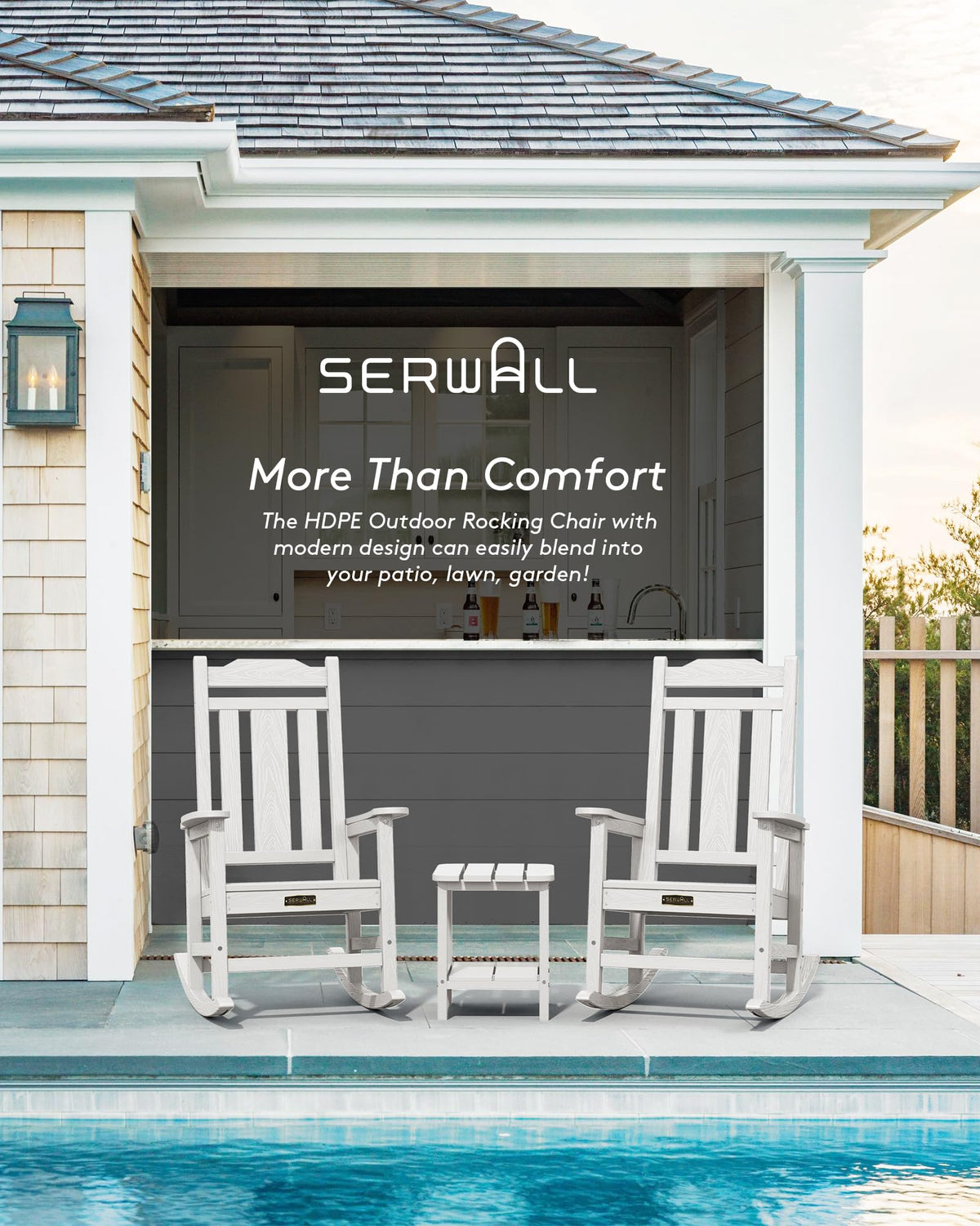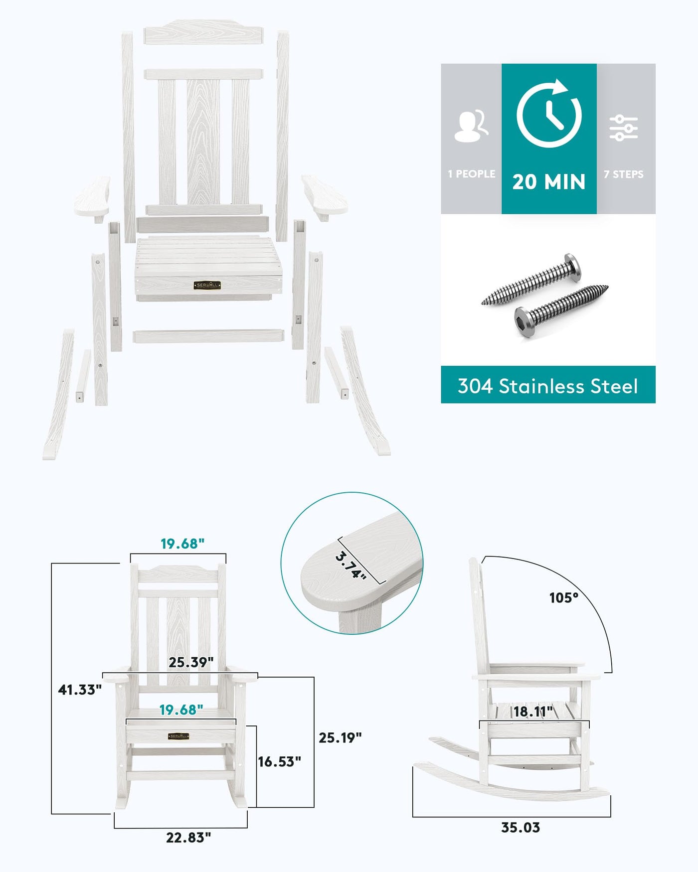 ?Hdpe Rocking Chair? Made Of Premium Hdpe(High-Density Polyethylene) Material, This Poly Rocking Chair Makes Up The Disadvantages Of The Wood And Ps Rocking Chair, It Is More Durable And Sturdy, Which Can Stand The Test Of Time. Along With Its Wood Like Texture, Making Serwall Rocking Chair More Like Real Wood. | ?Size & Weight Capacity?Measuring With 32.5'D X 25.5'W X 41.7'H, Our Heavy Duty Rocking Chair Can Hold Up To 380Lbs. The Seat Width Is 19.7” Ensures It Can Accommodate Various Body Types. The Chair Weights 38.3Lbs Which Is Heavy Enough To Prevent Blowing. | ?Widened Backrest?This Patio Rocking Chair Is Designed With An Updated Ergonomic Backrest. The Centre Slat Width Is About 5”, Which Can Better Disperse The Pressure While Reclining In The Chair. This Design Can Greatly Prevent The Back From Bending. | ?All Weather Use?Enjoy Outdoor Relaxation Without Interruption. Our Front Porch Rocking Chairs Are Less Prone To Warping, Fading, Or Rusting, Ensuring That Your Rocking Chair Remains In Good Condition And Free From The Various Weather Conditions. | ?Anti-Rollover?Roll-Over Is Never The Concern. Featuring Four-Supporting Points With Cross Bars, These Front Porch Rocking Chairs Evenly Disperse The Pressure To Each Point. The Accurate Calculation Of The Rocking Radian Ensures Personal Safety And Achieve Ultimate Relaxation. | ?30-Mins Installation?Partial Installation Required. Making Your Patio Rocking Chair In 30 Mins. Coming With Hardware Set And Instruction, The Installation Will Be A Simple Process. Instructional Video Is Provided On Our Website. (Attn: Do Not Screw The Screws Tightly Before Finishing). | ?Low Maintenance?No Painting, Staining, Waterproofing, Or Similar Maintenance Required. Using A Brush Or Cloth To Wipe Off Dust And Cobwebs, Then Use Soap-Soaked Cloth To Clean Stuck-On Dirt And Grime. | ?Customer Service?Serwall Stands Behind Its Product. We Are Committed To Solving Any Product Problems. Please Feel Free To Contact Us Through Our Amazon Store If You Need Any Help. | ?Comfortable Rocking Chair?Comfort Is Our Primary Focus. Serwall Outdoor Rocking Chair Is Designed With An Ergonomic Shape, Comfortable Seating, And A Supportive Backrest To Ensure A Relaxing Experience. | ?Indoor & Outdoor Use?This Hdpe Rocking Chair With Wood Texture Is More Stylish, Which Can Be Used Indoor And Outdoor, Will Complete Your Living Room Or Outdoor Patio.